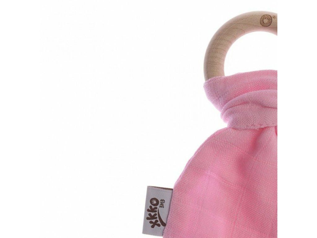 Drevené hryzátko XKKO BMB so šuštivými lístkami z extrémne jemného bambusového mušelínu. Bambusová viskóza je antibakteriálna a nespôsobuje žiadnu alergickú reakciu.