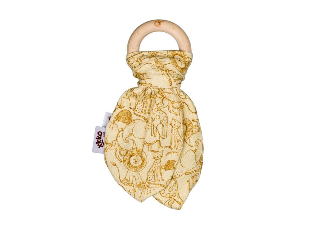 Drevené hryzátko XKKO BMB so šuštivými lístkami z extrémne jemného bambusového mušelínu. Bambusová viskóza je antibakteriálna a nespôsobuje žiadnu alergickú reakciu.