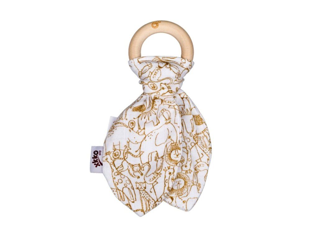 Drevené hryzátko XKKO BMB so šuštivými lístkami z extrémne jemného bambusového mušelínu. Bambusová viskóza je antibakteriálna a nespôsobuje žiadnu alergickú reakciu.