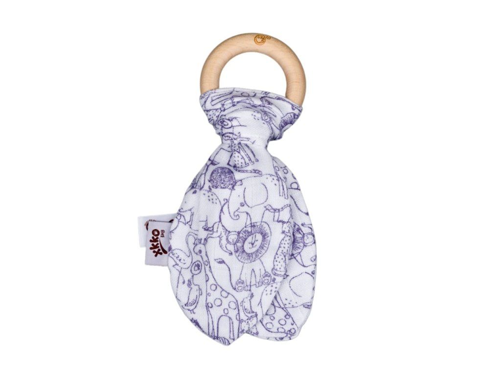 Drevené hryzátko XKKO BMB so šuštivými lístkami z extrémne jemného bambusového mušelínu. Bambusová viskóza je antibakteriálna a nespôsobuje žiadnu alergickú reakciu.