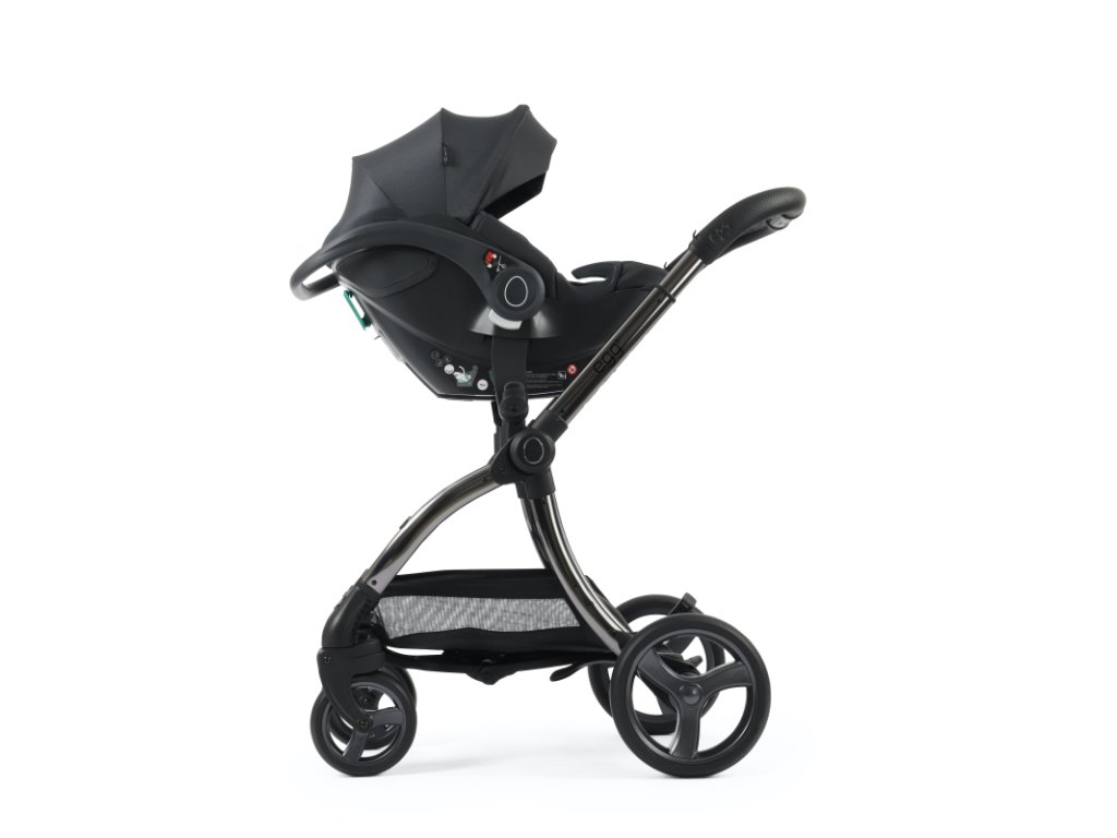 - Nasadenie autosedačky egg Shell do multi adaptérov na podvozku kočíka egg® a egg²® je rýchle a jednoduché a zvládnete to jednou rukou: rukoväť autosedačky nastavíte do kolmej polohy, autosedačku nasadíte na adaptéry a sklopením rukoväti dozadu dôjde k uzamknutiu poistky autosedačky v ráme. Spätným pohybom rukoväte do kolmej polohy poistku odistíte a autosedačku jedným pohybom odstránite z podvozku