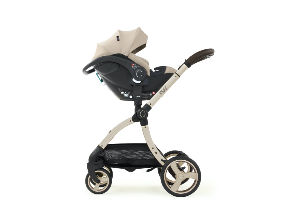 - Nasadenie autosedačky egg Shell do multi adaptérov na podvozku kočíka egg® a egg²® je rýchle a jednoduché a zvládnete to jednou rukou: rukoväť autosedačky nastavíte do kolmej polohy, autosedačku nasadíte na adaptéry a sklopením rukoväti dozadu dôjde k uzamknutiu poistky autosedačky v ráme. Spätným pohybom rukoväte do kolmej polohy poistku odistíte a autosedačku jedným pohybom odstránite z podvozku