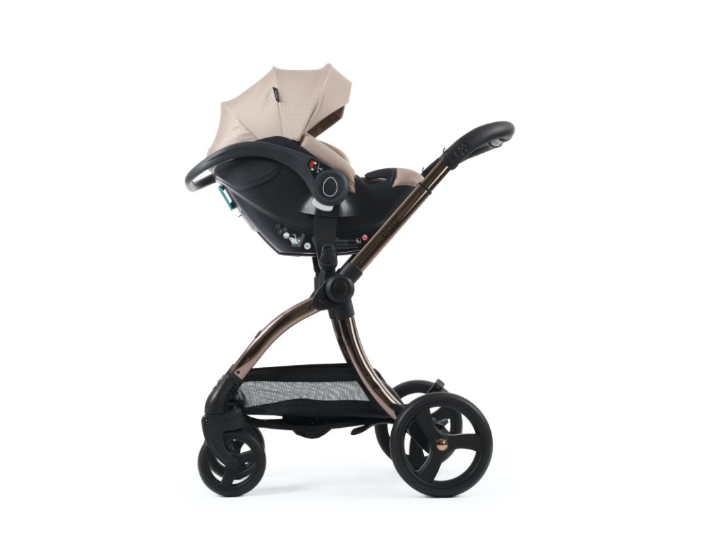 - Nasadenie autosedačky egg Shell do multi adaptérov na podvozku kočíka egg® a egg²® je rýchle a jednoduché a zvládnete to jednou rukou: rukoväť autosedačky nastavíte do kolmej polohy, autosedačku nasadíte na adaptéry a sklopením rukoväti dozadu dôjde k uzamknutiu poistky autosedačky v ráme. Spätným pohybom rukoväte do kolmej polohy poistku odistíte a autosedačku jedným pohybom odstránite z podvozku