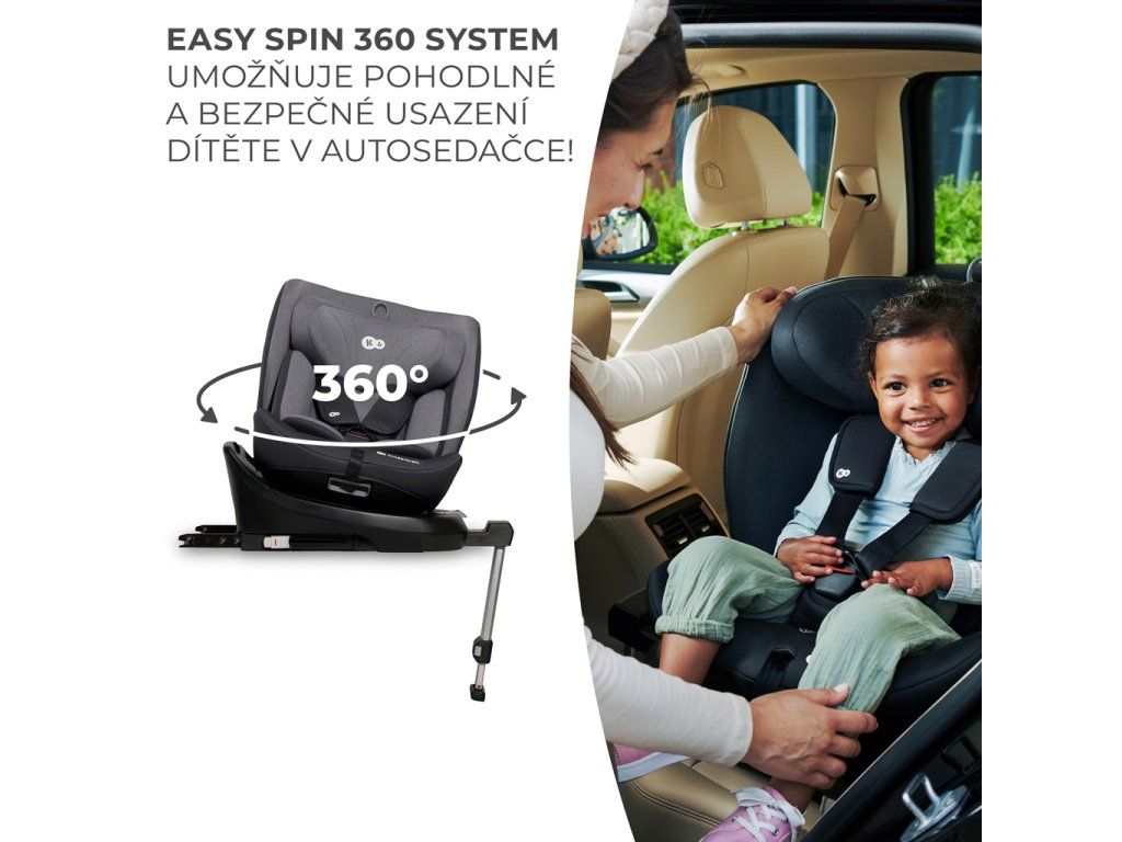 Systém EASY SPIN 360° uľahčuje nielen pripútanie dieťaťa v detskej sedačke pomocou vnútorných popruhov. Umožňuje tiež rýchlu zmenu nastavenia (RWF a FWF) bez toho, aby ste celú detskú sedačku museli vybrať z auta. Na to aby ste vaše dieťa posadili a pripútali, stačí keď odblokujete bezpečnostnú západku a otočíte sedačku smerom k sebe, alebo otočte sedačku dopredu v smere jazdy.