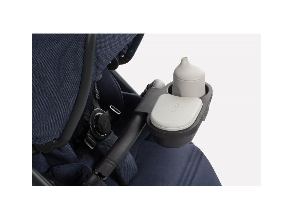 Originálny pultík na desiatu je určený na pripevnenie na madlo kočíka pred dieťa. Súčasťou pultíka je vyberateľný silikónový kelímok s náustkom a krabička na jedlo s viečkom. Silikónový mäkký materiál je bezpečný a príjemný pri používaní. Je odolný vysokým aj nízkym teplotám a nie je náchylný na vytváranie škvŕn od farebných potravín. Keď dieťaťu spadne na zem, nehrozí jeho rozbitie.