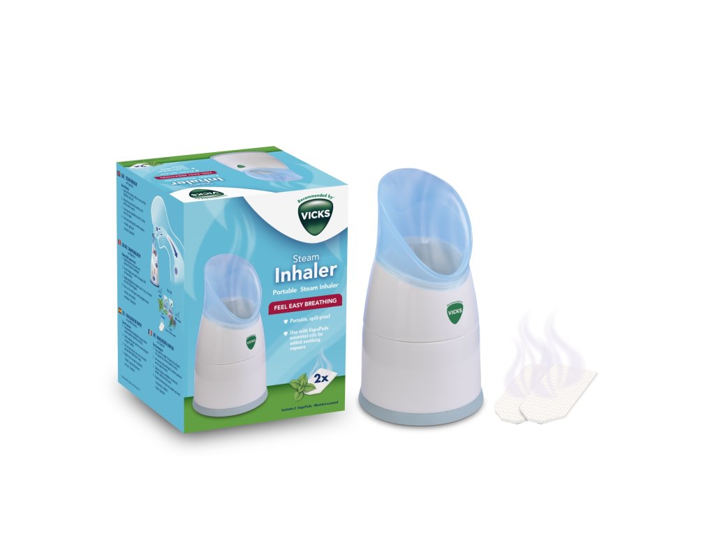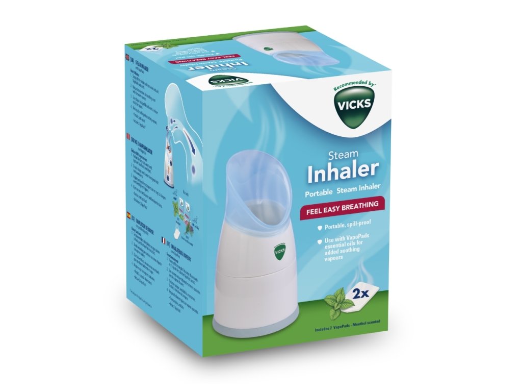 Kompaktný a ľahko použiteľný osobný parný inhalátor Vicks V1800EUV1 účinne zmierňuje príznaky prechladnutia, nádchy a chrípky a uľahčuje dýchanie. Poskytuje dočasnú úľavu od upchatého nosa a dutín. Vďaka svojej prenosnosti je ideálny aj na cesty. Pre zvýšenie komfortu je možné ho používať s Vicks VapoPads alebo VapoSteam. Bezpečný dizajn zabraňuje úniku vody počas až 15-minútovej inhalácie.