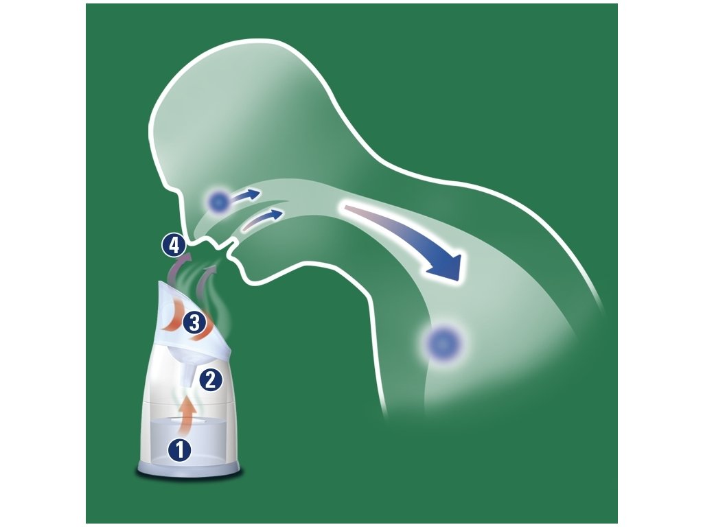 Otvorte inhalátor a naplňte ho horúcou vodou, následne pridajte voňavú tabletu esenciálneho oleja VapoPads® a vdychujte upokojujúce výpary. Týmto spôsobom efektívne zmiernite nepríjemné príznaky prechladnutia a chrípky.