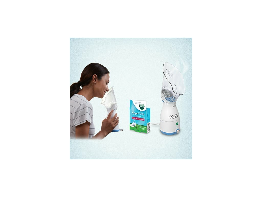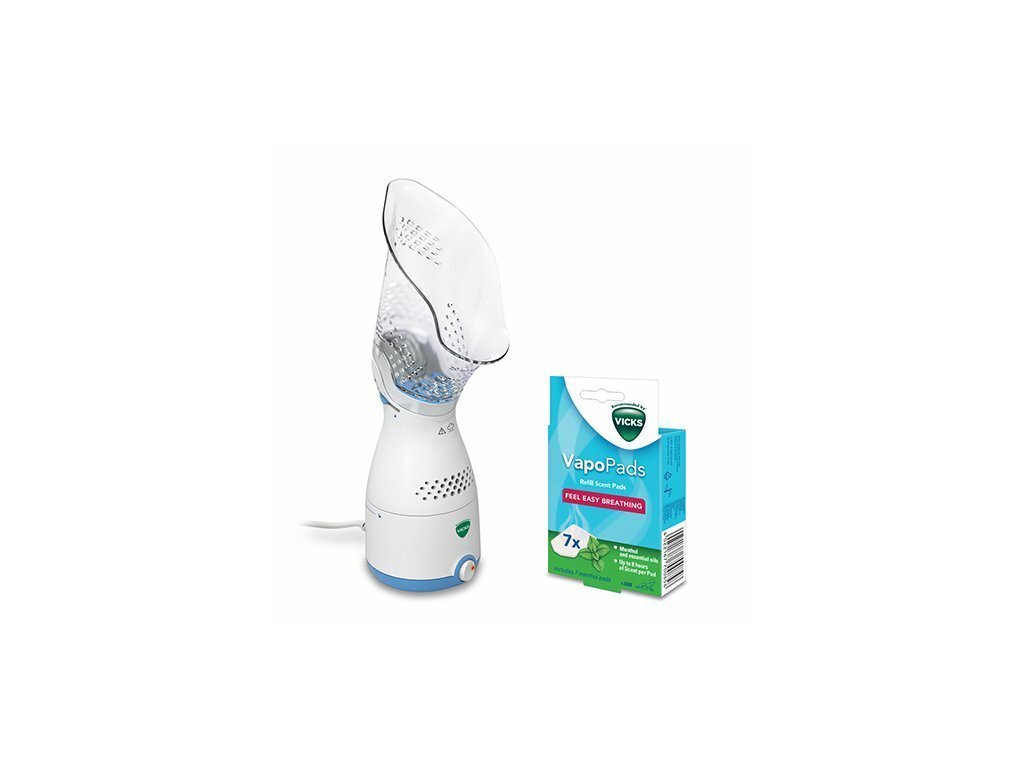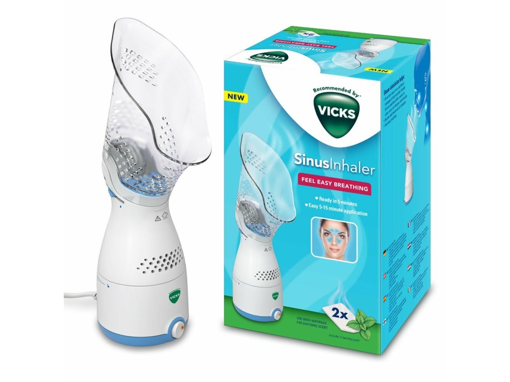 Osobný parný inhalátor Vicks Sinus Inhaler VH200E s ergonomicky tvarovanou maskou na tvár cielene dodáva 99,99 % čistej pary bez baktérií. Vdychovanie tejto pary pomáha preniknúť do nosa, dutín a hrdla, čím prirodzene zmierňuje suchosť a podráždenie spôsobené prechladnutím. Tento elektrický inhalátor na dutiny poskytuje teplú, upokojujúcu paru, ktorá prirodzene a účinne uľahčuje dýchanie a prináša úľavu už do 15 minút od použitia. Navrhnutý je výhradne pre použitie s VapoPads (2 vložky s mentolovou vôňou sú súčasťou balenia), ktoré dodávajú upokojujúcu mentolovú paru pre ešte väčšie pohodlie.