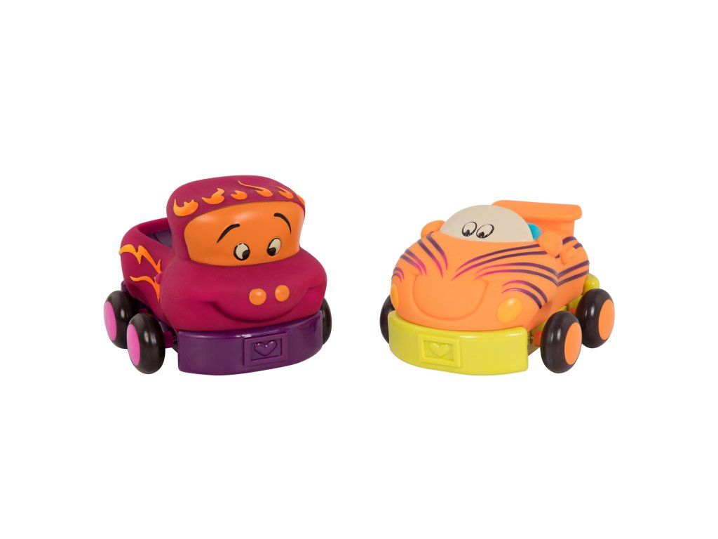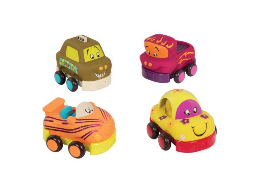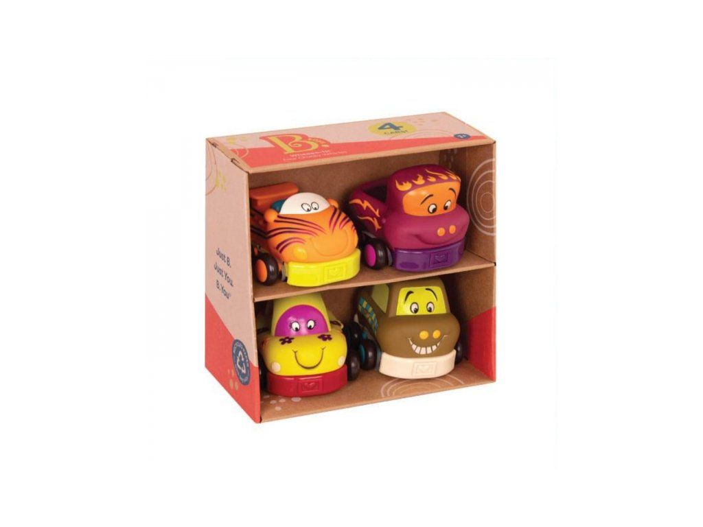 Štyri mäkké plastové autíčka Wheee-ls! sú ideálne pre najmenších milovníkov áut. Autíčka na zotrvačník po natiahnutí dozadu samé pôjdu dopredu. Po stlačení osobné auto zvoní, nákladiak cinká, pretekárske auto hrká a taxík píska.