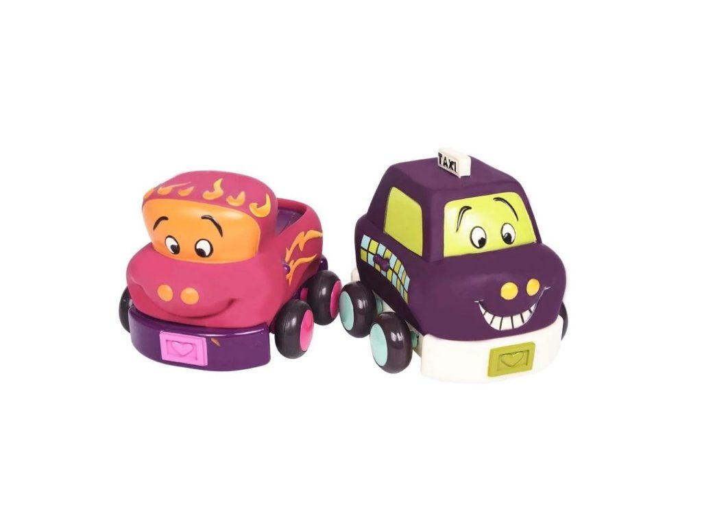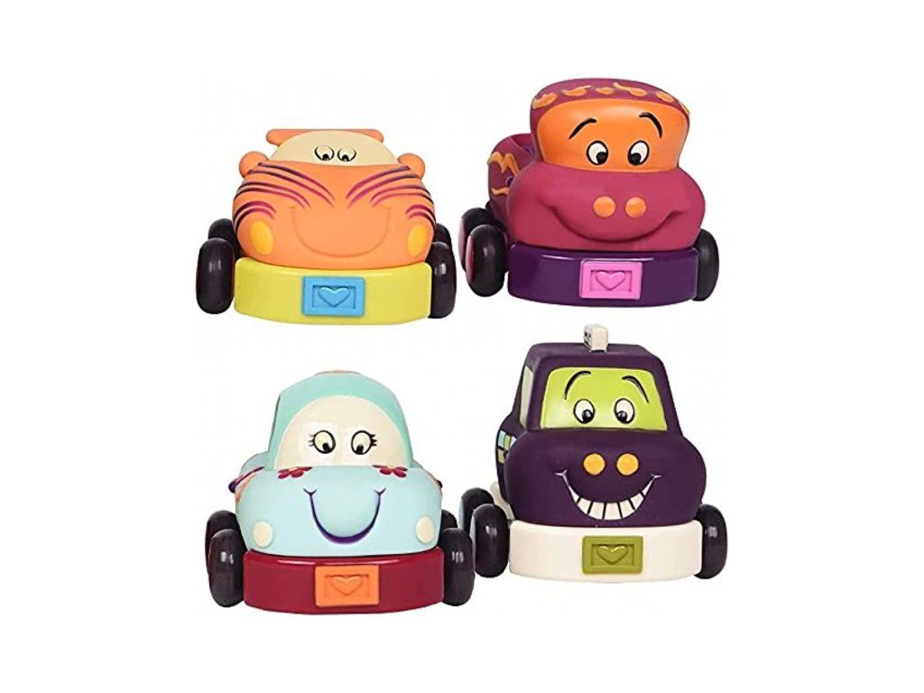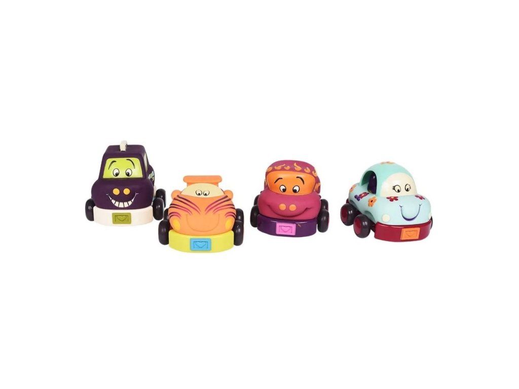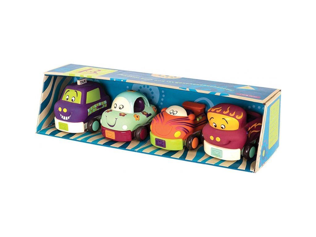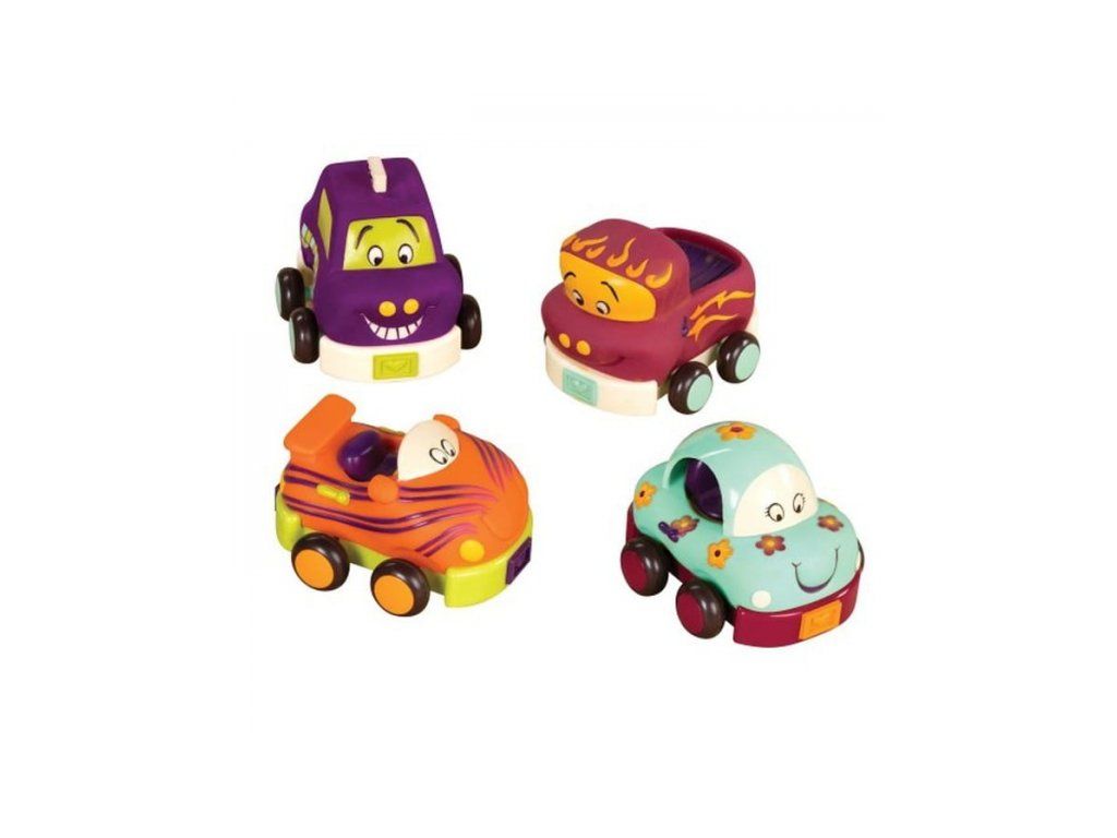 Štyri mäkké plastové autíčka Wheee-ls! sú ideálne pre najmenších milovníkov áut. Autíčka na zotrvačník po natiahnutí dozadu samé pôjdu dopredu. Po stlačení osobné auto zvoní, nákladiak cinká, závodné auto hrká a taxík píska.