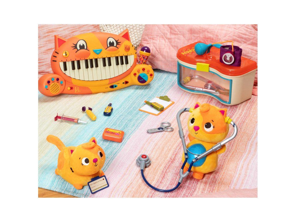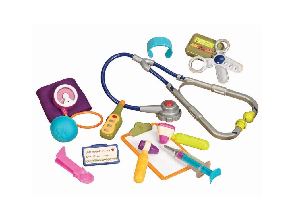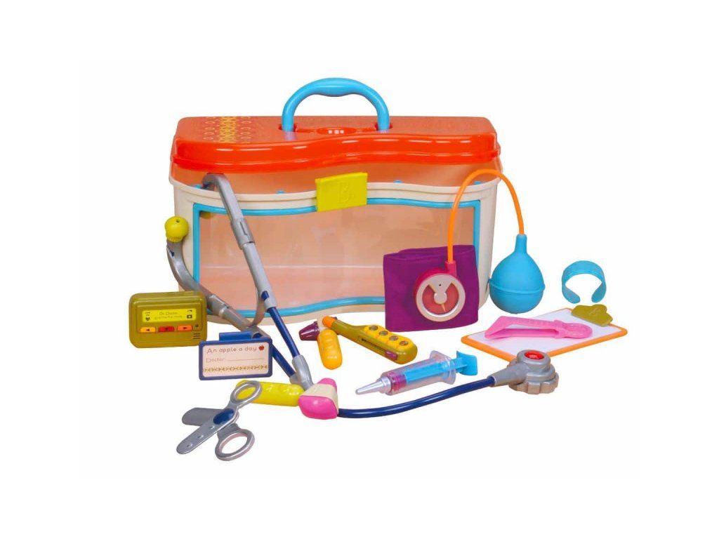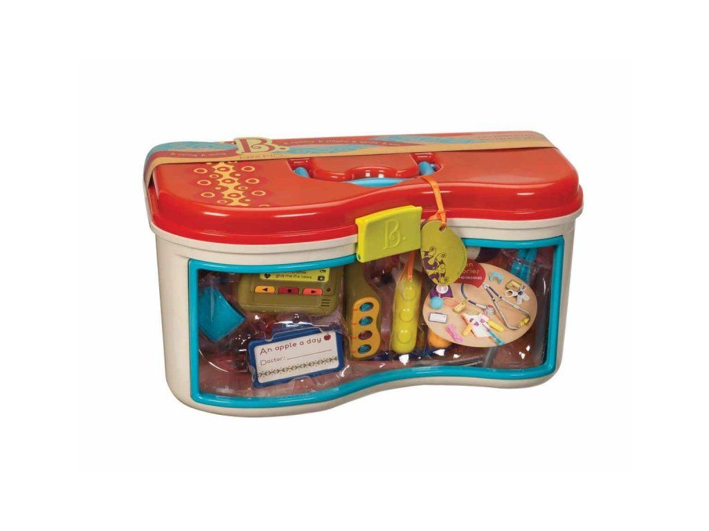 Obľúbená hra na doktora môže začať! Všetko, čo malý lekár alebo lekárka potrebujú, nájdu v pevnom kufríku Btoys s uchom na prenášanie. Kufrík obsahuje podložku na písanie s papierom, kladivko, otoskopy, teplomer, obväzy, menovku, stetoskop so zvukom tlkotu srdca, tlakomer, pinzetu, striekačku, bezpečné nožnice a pípatko. 2 batérie AAA pre pípatko nie sú súčasťou, 3 batérie AG13 (1,5V) pre stetoskop sú súčasťou. Neobsahuje bisfenol. Vhodné pre deti od 18 mesiacov do 5 rokov.