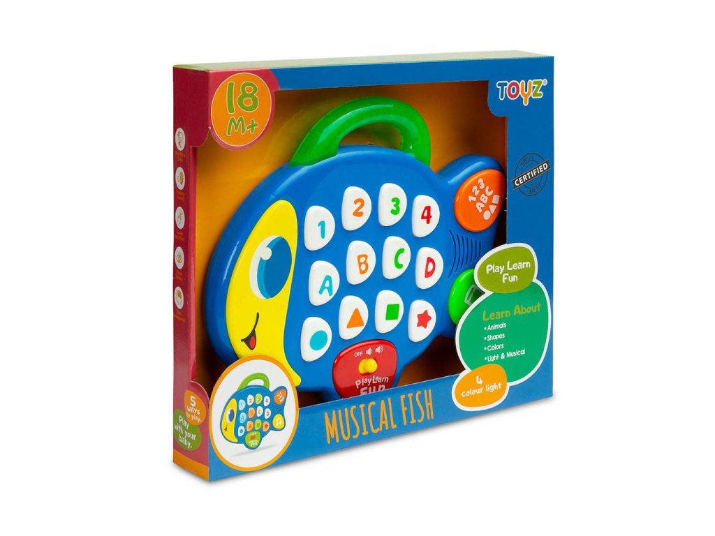 Vzdelávacia hračka hudobná rybka od spoločnosti TOYZ je ideálnou hračkou pre najmenších. Osvetlená klávesnica s farebnými tlačidlami pomáha učiť základné tvary, písmená a čísla v angličtine.