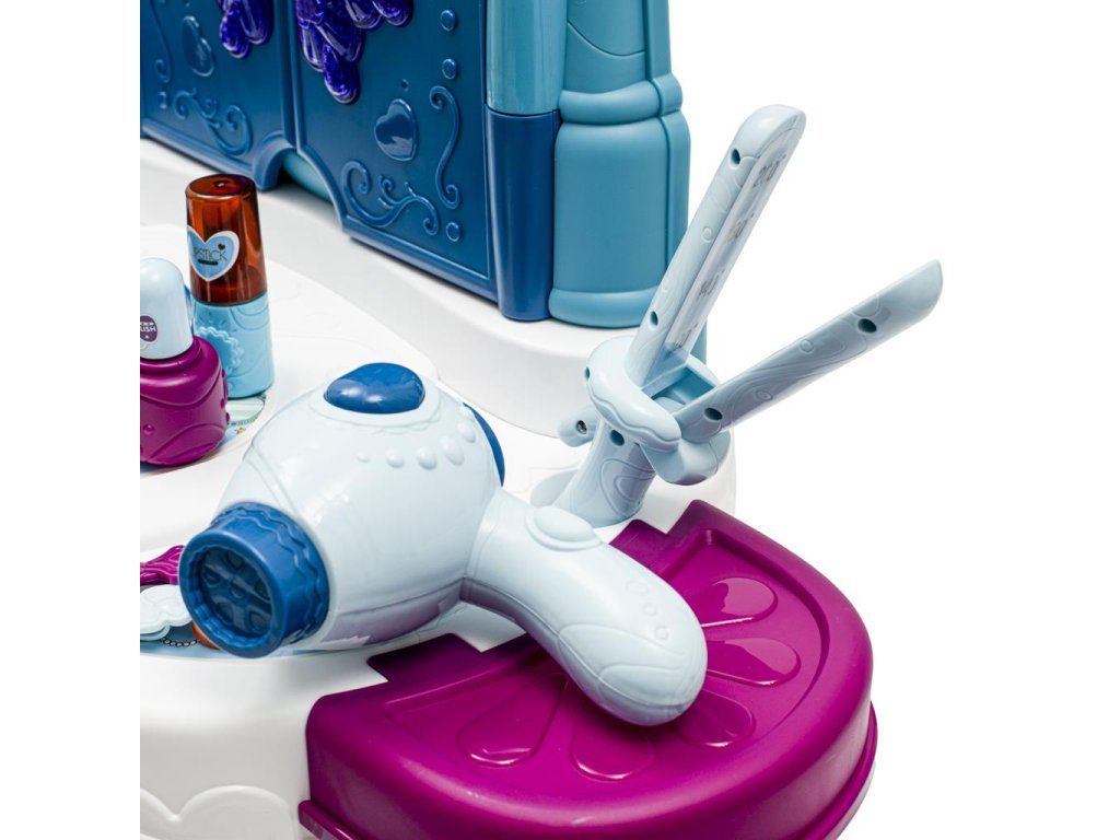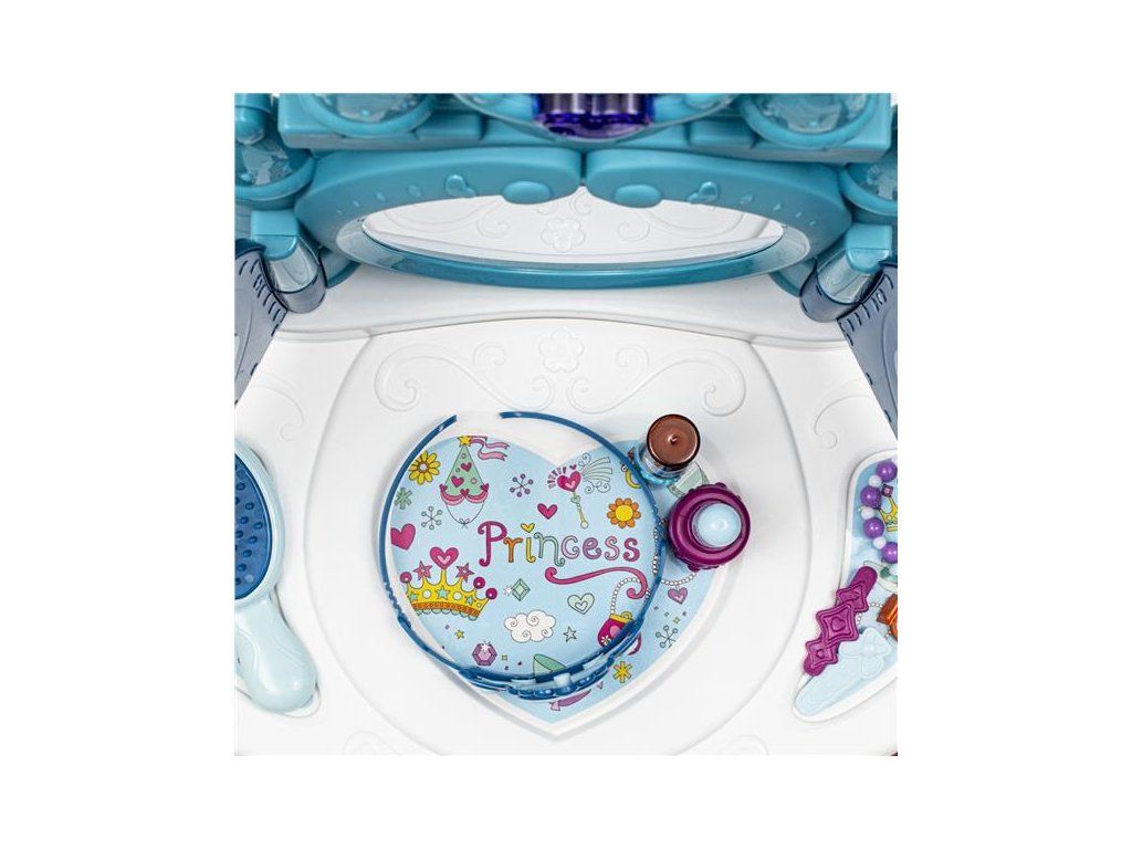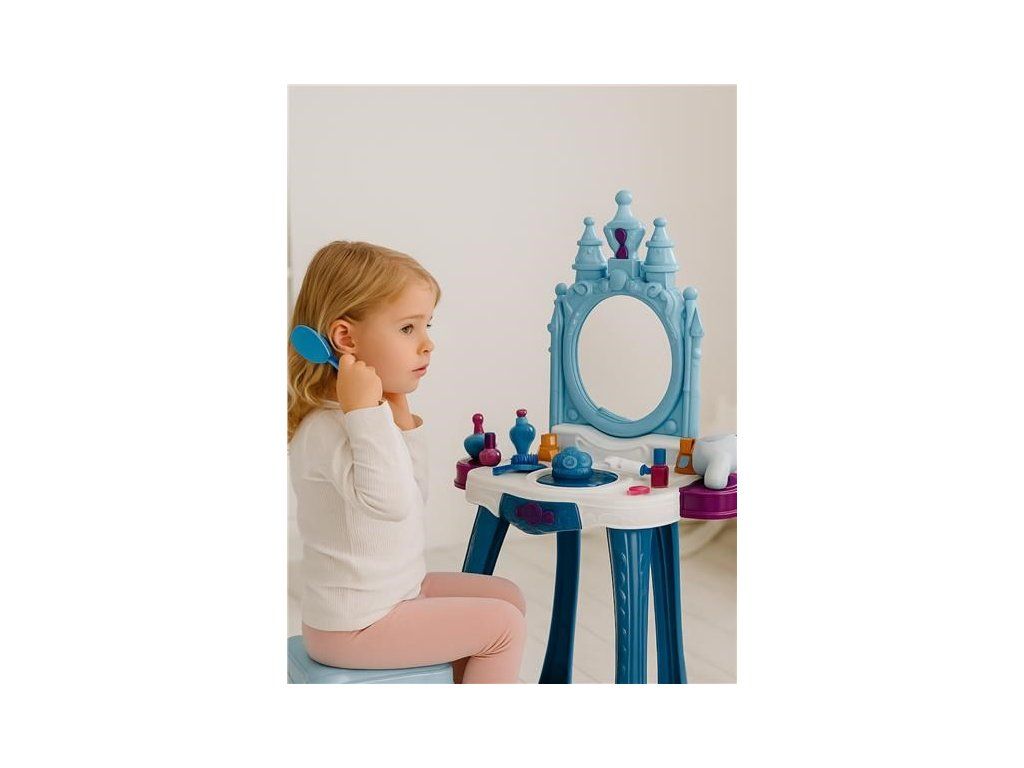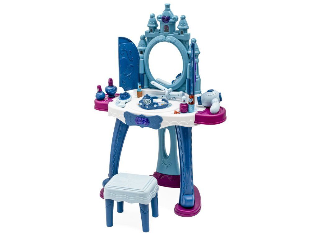 Detský toaletný stolík so stoličkou obsahuje sadu makiet kozmetiky, ako je fén, hrebeň, lak na nechty, prstene, kvety do vlasov, náramky, náhrdelník a nálepky. Súprava obsahuje aj umelú paličku, po stlačení paličky sa otvorí zrkadlo. Toaletný stolík je vybavený zásuvkou na odkladanie drobných predmetov. Súprava vyžaduje 5 batérií AAA, ktoré nie sú súčasťou balenia.