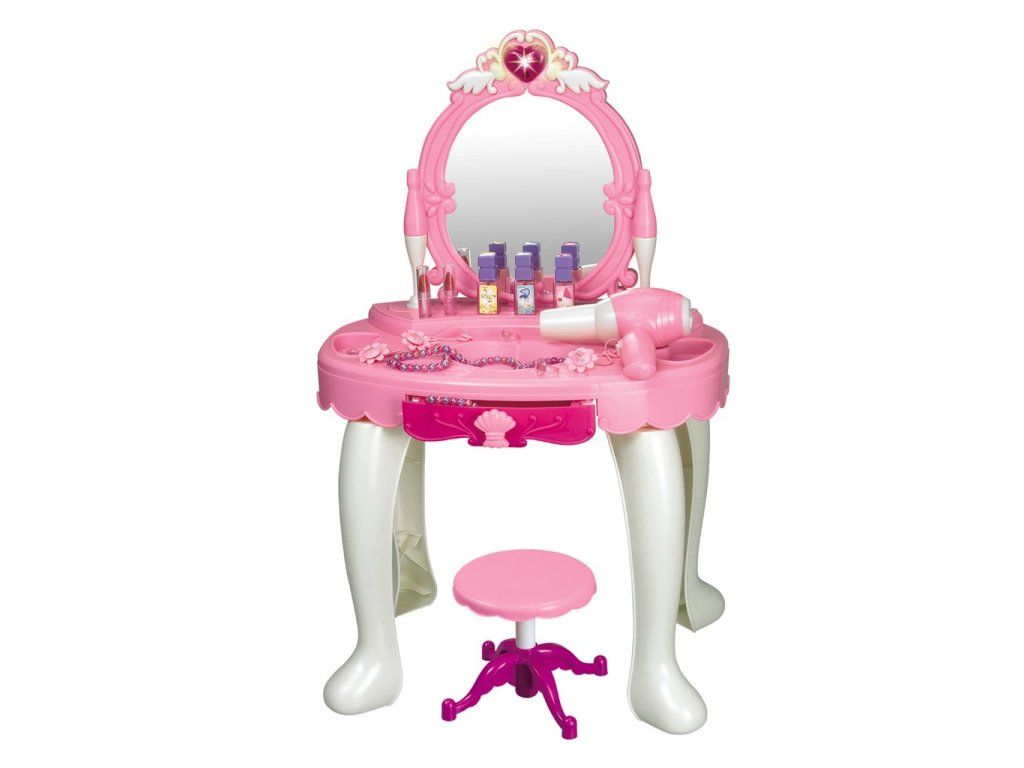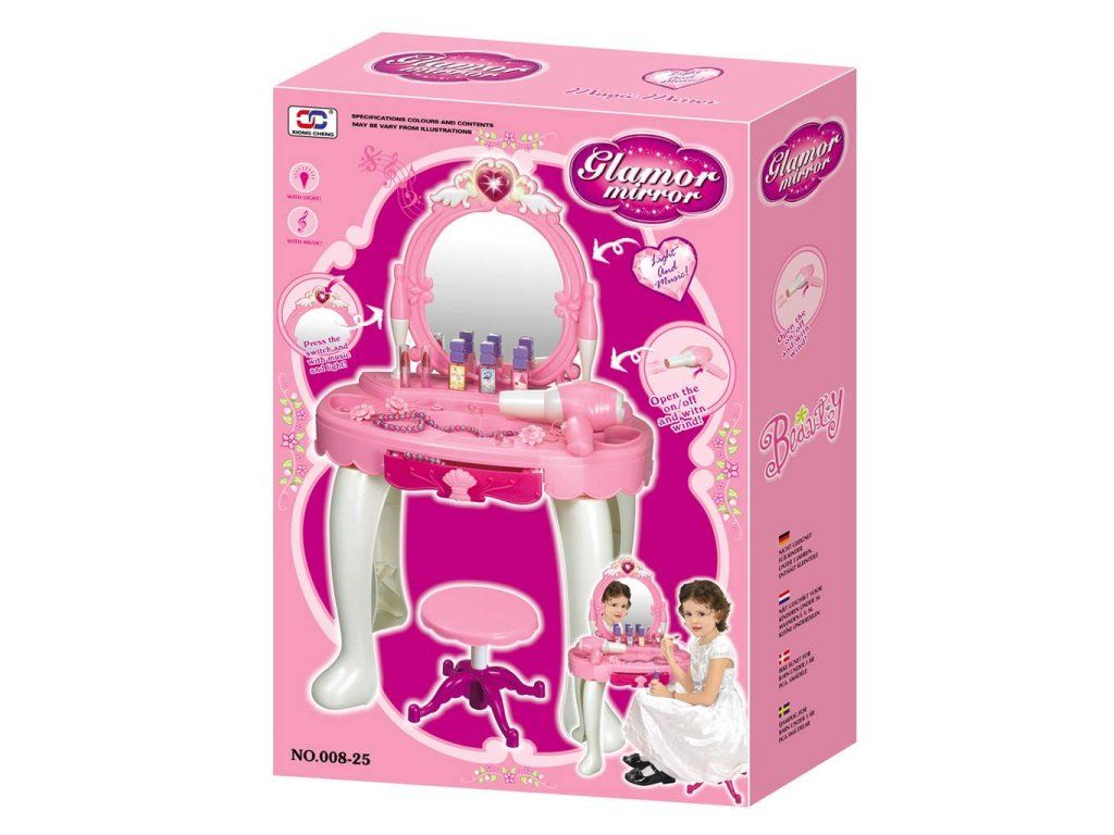 Krásny detský toaletný stolík - najlepšia hračka pre každú dievčatko! Vyrobený z kvalitného plastového materiálu. Má veľké zrkadlo, stoličku, poličku a zásuvku. Zrkadlo hrá melódiu a svieti. Súčasťou je tiež fén na batérie, ktorý po zapnutí fúka. Okrem toho sada obsahuje fľaše s "parfumy", čelenku, kefa na vlasy, rúže, prstienky, ručné zrkadielko, gumičky do vlasov. Batérie nie sú súčasťou balenia.Rozmery: