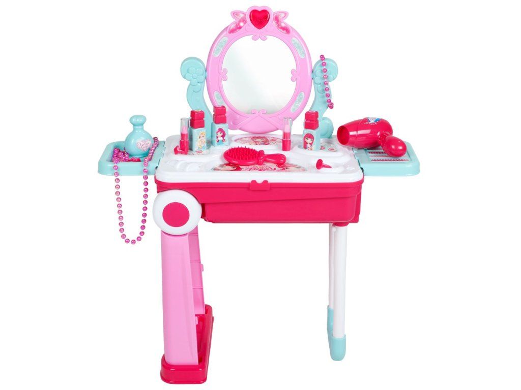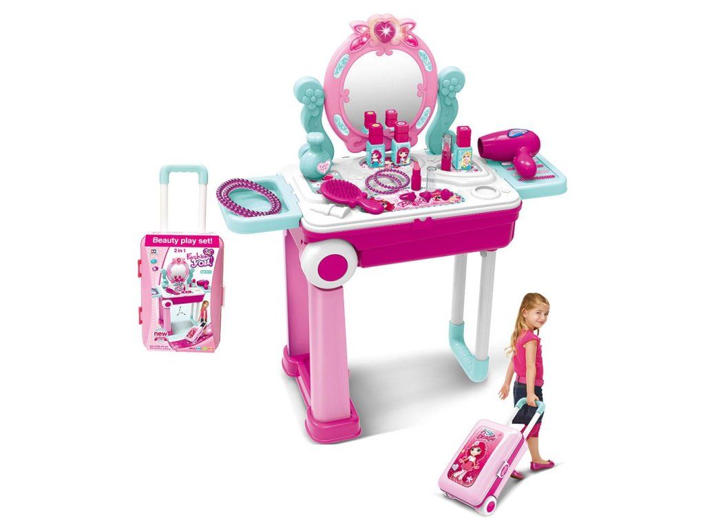 Krásny detský toaletný stolík v kufríku Baby Mix ukrýva v sebe skutočný poklad pre každú malú princeznú. Po otvorení zmeníte kufrík v naozajstný toaletný stolík obsahujúci zrkadlo so svetielkom v tvare srdiečka, ktoré po stlačení vydáva čarovný zvuk. 3 batérie typu AAA nie sú súčasťou balenia. V stolčeku ďalej vaša princezná nájde fén, dva náramky, náhrdelník, tri prstienky, tri fľaštičky s lakom na nechty, dva balzamy na pery, hrebeň na vlasy a parfum. Kufrík je vybavený kolieskami a teleskopickou tyčou, a vďaka ním si vaše dievčatko môže kufrík vziať aj na cesty. Náš toaletný stolček je skvelým darčekom pre každé malé dievčatko. Sada neobsahuje skutočnú kozmetiku, celá je vyrobená z kvalitného plastu, preto je úplne bezpečná. Je určená pre deti od 3 rokov. Rozmery:- stolček: 60 x 53 x 24,5 cm