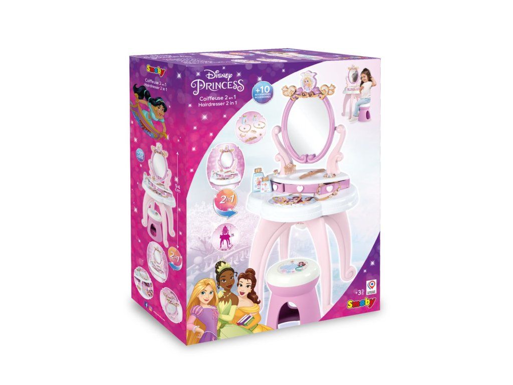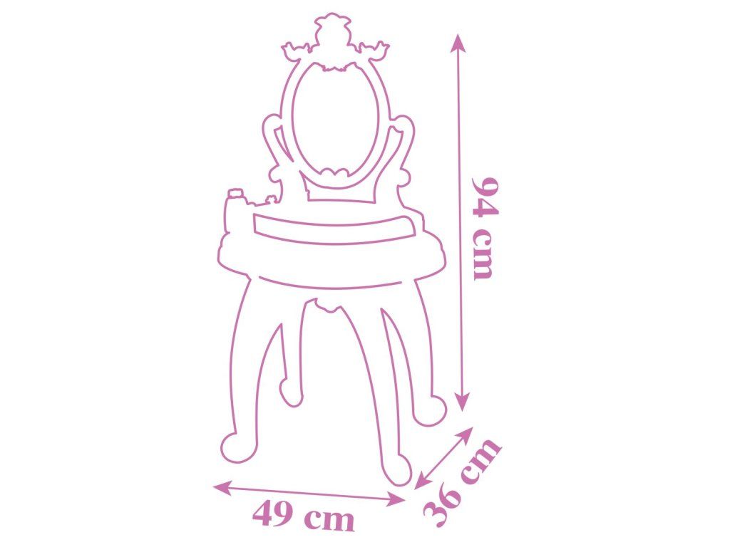 Toaletný stolík s motívom Disney princezien pre malé parádnice, s 3 zásuvkami, 10 ks príslušenstva (napr. čelenka, hrebeň, prstienky atď.). Súčasťou je otočné zrkadlo a stolička, nosnosť stoličky 50 kg. Rozmery: 49 x 94 x 36 cm.Dodatočné parametre