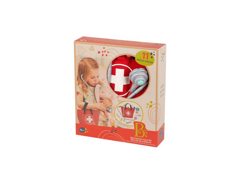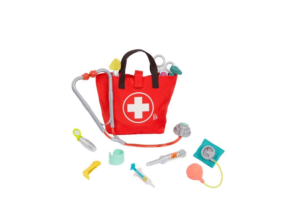 Obľúbená hra na doktora môže začať! Všetko, čo malý lekár alebo lekárka potrebujú, nájdu v pevnom taške s uchom na prenášanie. Súprava obsahuje otoskop, teplomer, stetoskop, tlakomer, pinzetu, striekačku, zrkadlo, obväz, bezpečné nožnice a kladivko.