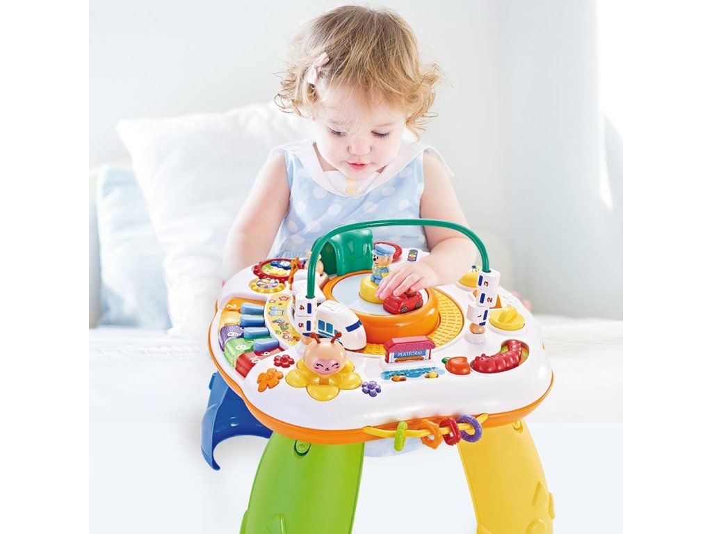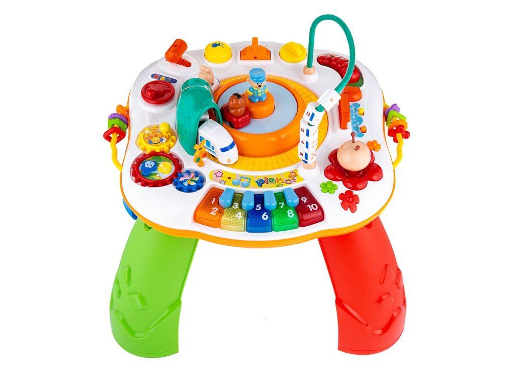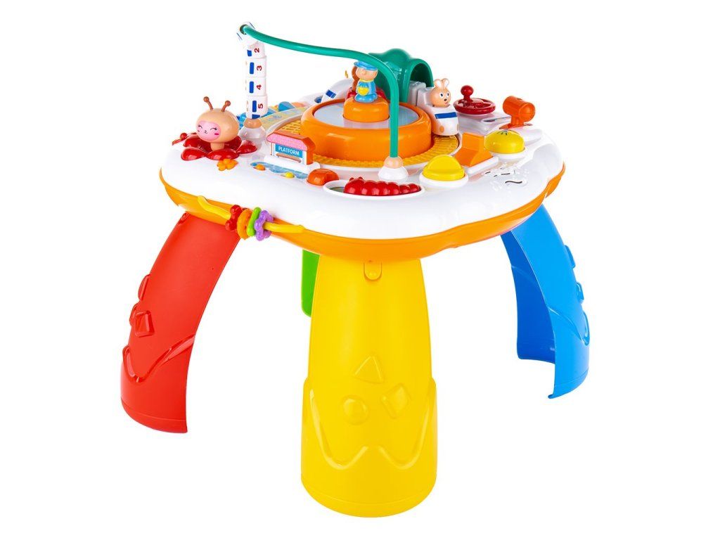 Hovoriaci a hrajúci interaktívný stolček New Baby s jazdiacim vláčikom je určený deťom od 10 mesiacov a obsahuje veľké množstvo funkcií, ktoré vaše dieťa zabaví na dlho. Stolček prehrá 12 melódiií a 4 pesničky, dialógy, vety a slová v slovenčine alebo češtine. Stolček je možné používať zložený na nohách, alebo možno nohy odmontovať pre jednoduché prevážanie, alebo použitie na cestách.