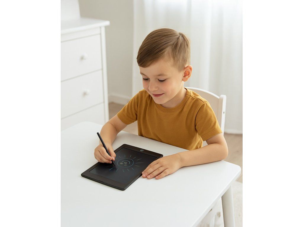 Stačí použiť priložené pero, ktoré je citlivé na tlak a umožňuje vytvárať rôzne hrúbky čiar, alebo kresliť priamo prstom. Jedným tlačidlom môžete ľahko vymazať celý obsah obrazovky. Vďaka ľahkej a odolnej konštrukcii je tabuľka ľahko prenosná a ideálna na použitie doma, na cestách aj v škole.