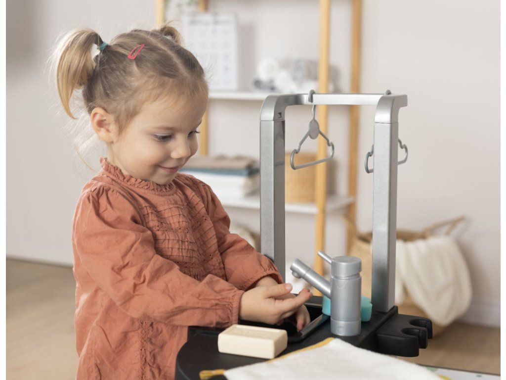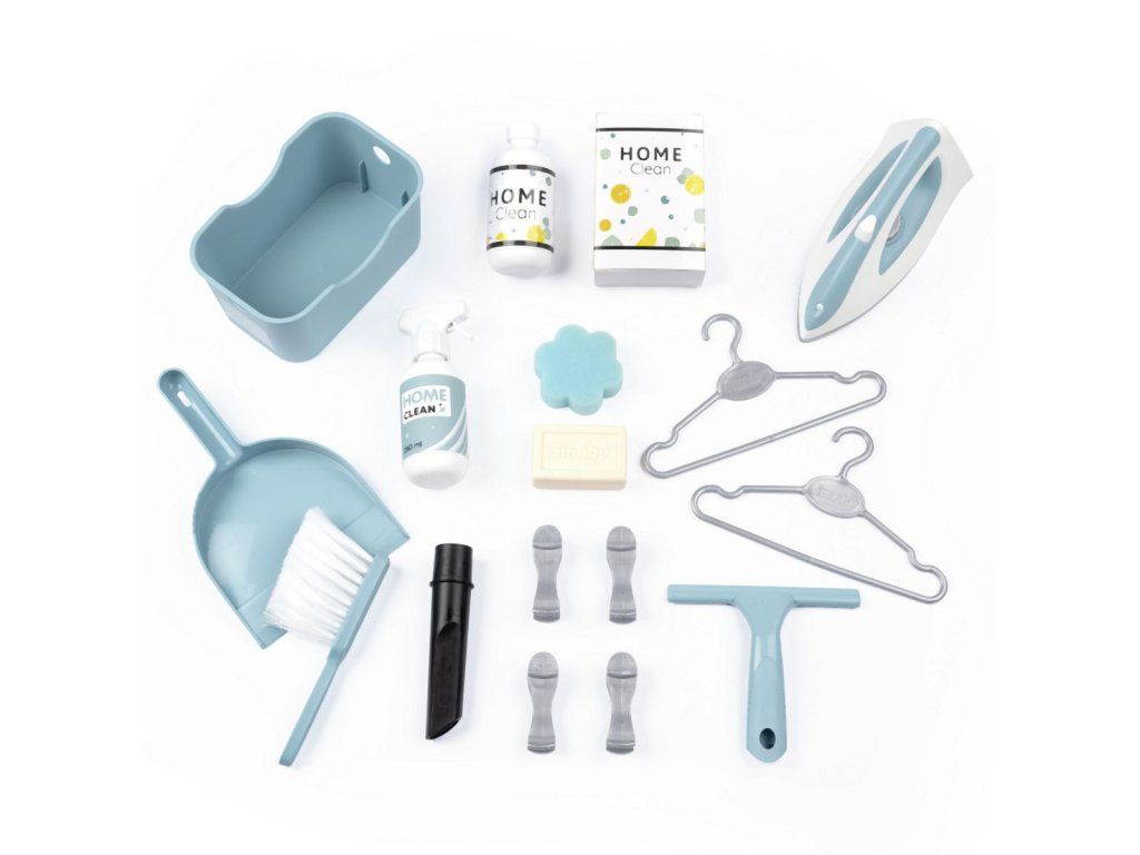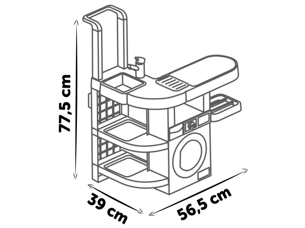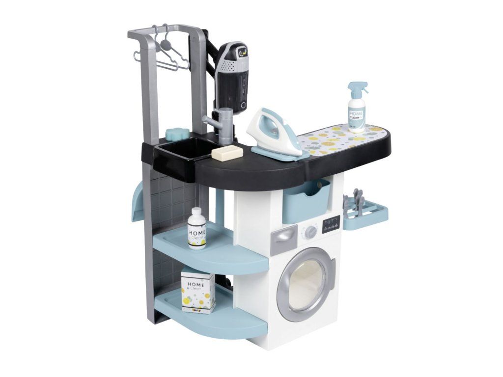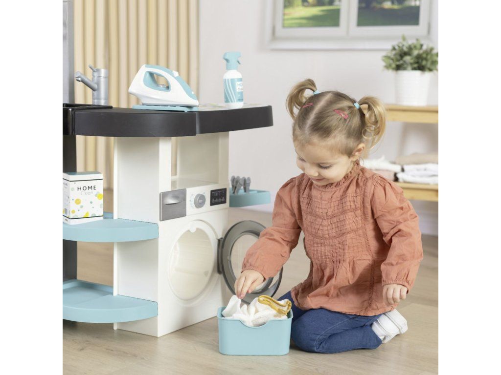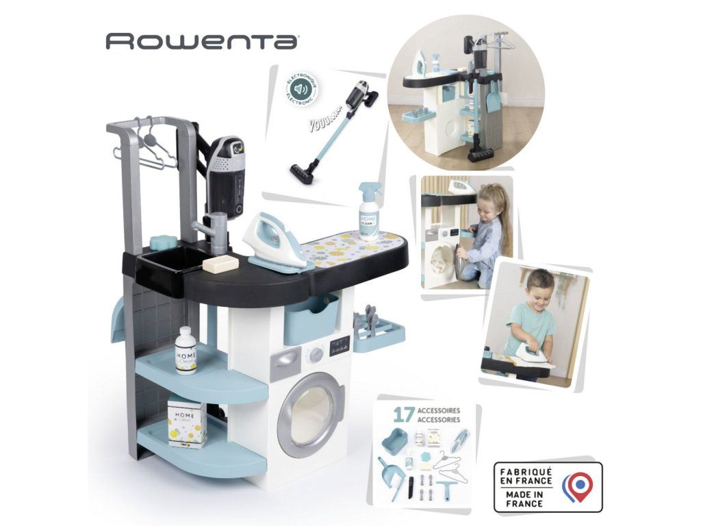 Práčovňa 3 v1 so žehličkou a dokonalou replikou vysávača Rowenta X Force Flex so zvukom. Súčasťou je 17 realistických doplnkov: kôš na bielizeň, ramienka, štipce na bielizeň, mydlo, žehlička, krabice s pracím práškom, kefa, prchovka atď. 4 hracie časti - práčka, umývadlo na ručné pranie, sušiaca časť a žehliaca doska. Rozmery výrobku (DxŠxV): 56,5 x 39 x 77,5 cm. Hmotnosť: 3,46 kg.Dodatočné parametre
