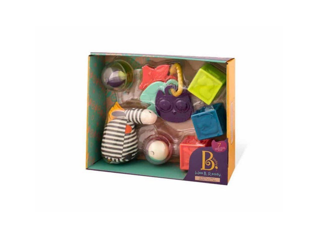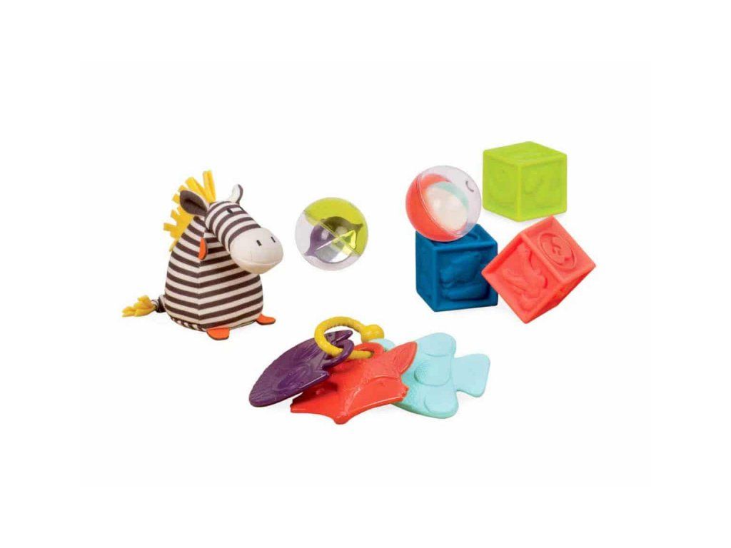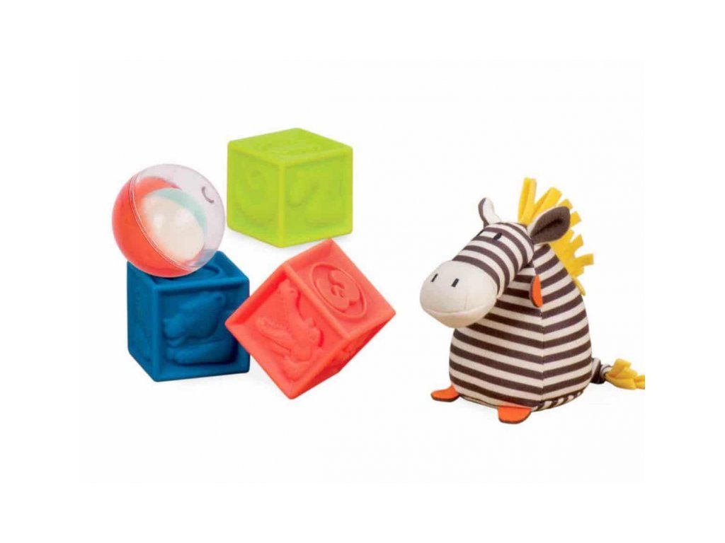 Darčeková sada hračiek pre deti od narodenia obsahuje 7 krásnych, farebných hračiek pre zábavu aj rozvíjanie detských zmyslov. Súčasťou sady je plyšová cinkajúca zebra, krúžok s tromi farebnými hryzátkami, dve priehľadné loptičky a tri kocky z mäkkého plastového materiálu, ktoré po stlačení pískajú a svojimi rôznorodými textúrami lákajú na skúmanie rukami i ústami.