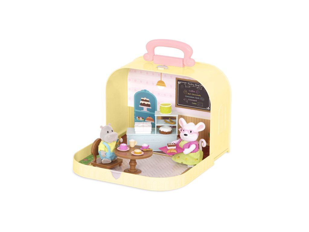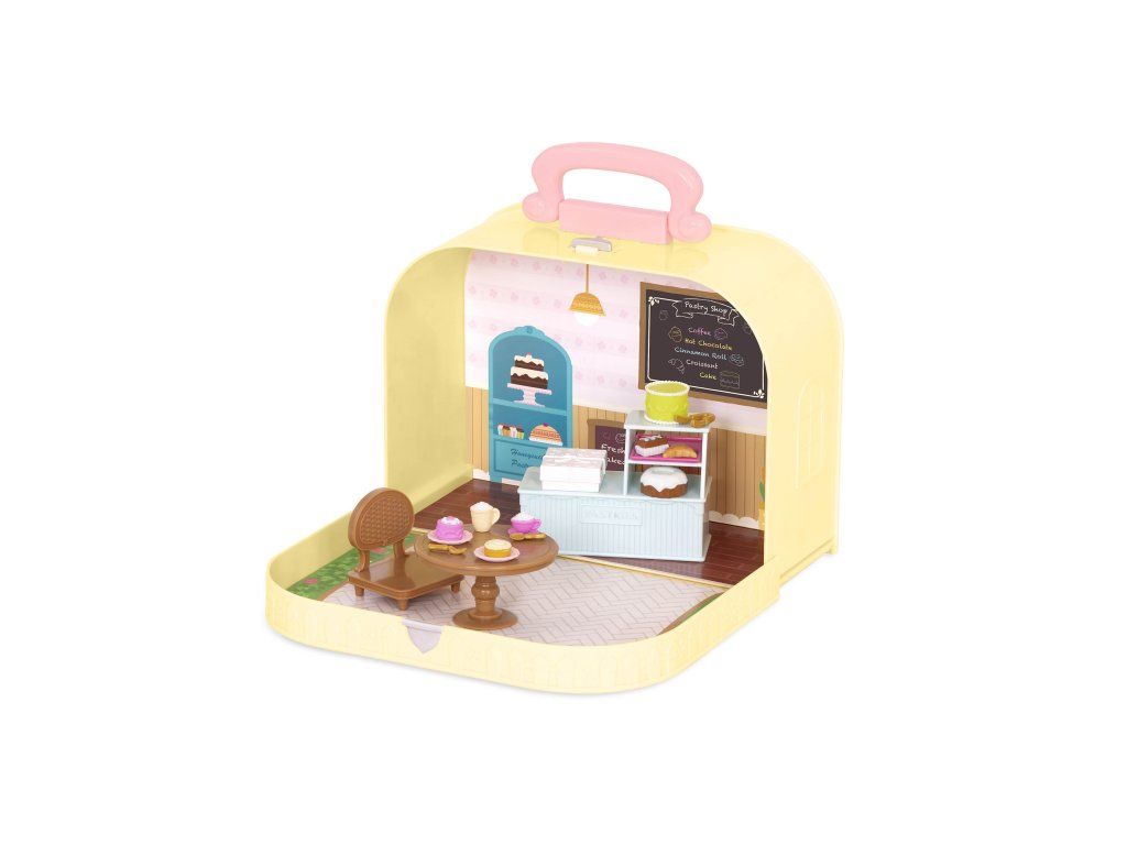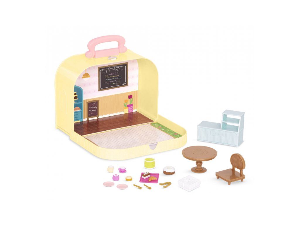 Cestovná sada hračiek Li'l Woodzeeze v praktickom kufríku umožní vášmu dieťaťu hrať sa kdekoľvek na dovolenke, výletoch či počas víkendu u starých rodičov. Kufrík sa po otvorení premení na bohato vybavenú cukráreň s nábytkom a doplnkami.