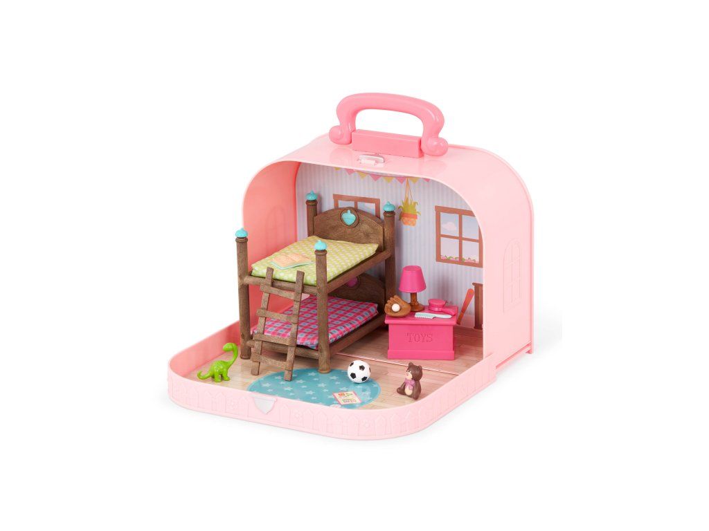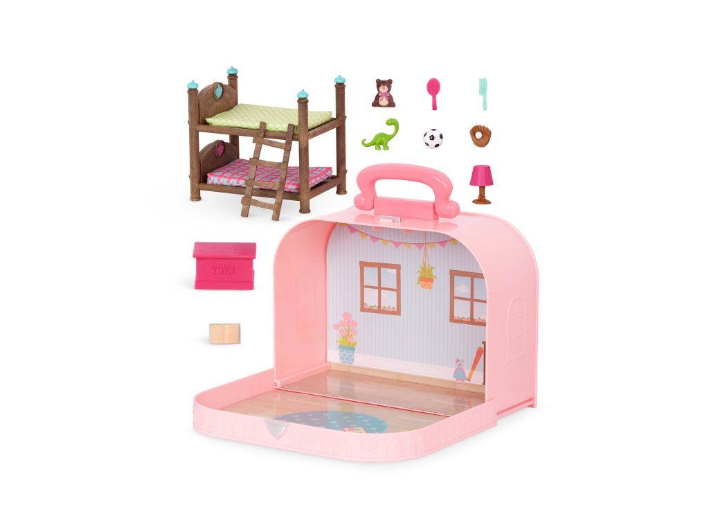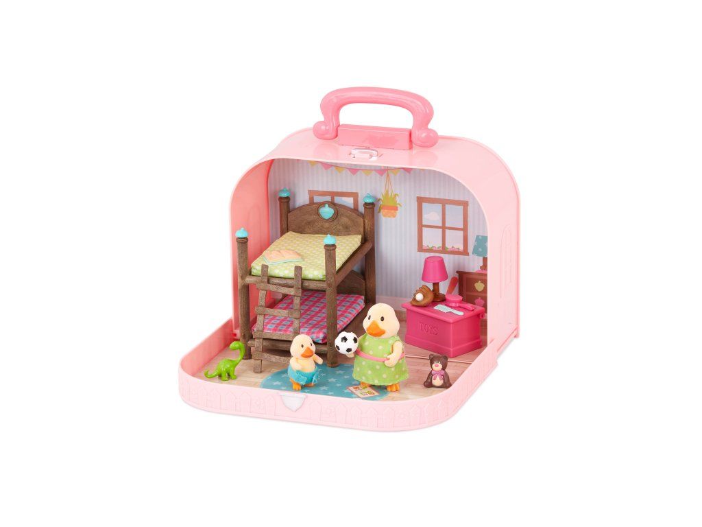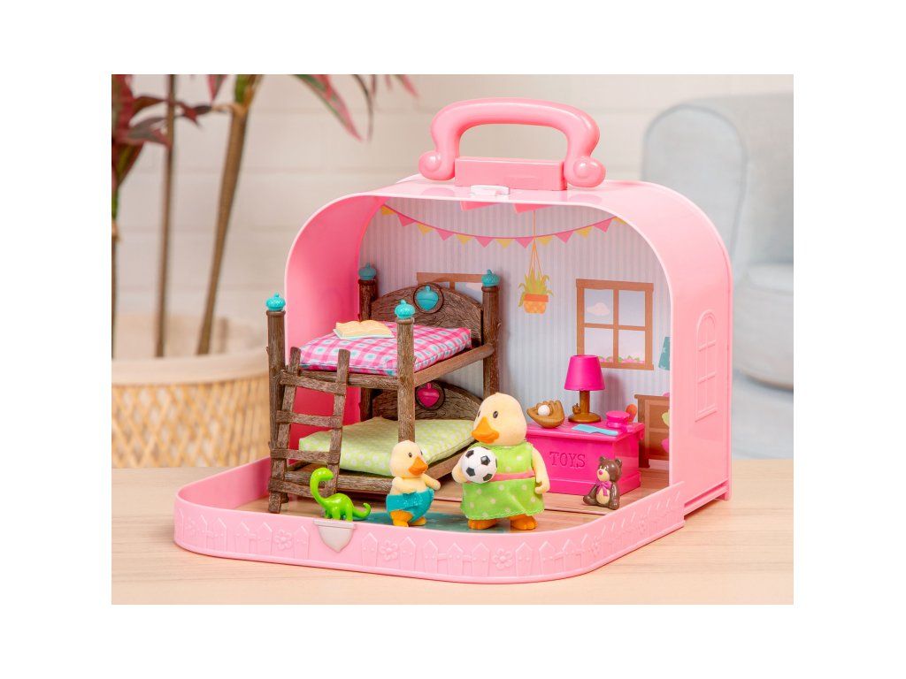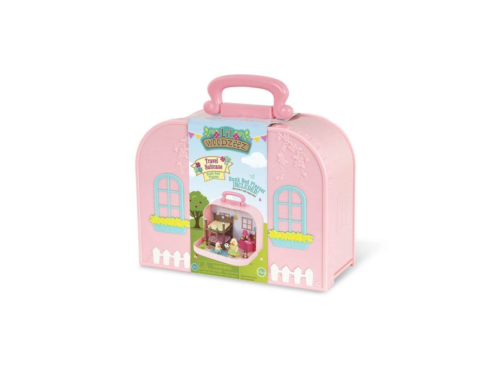 Cestovná sada hračiek Li'l Woodzeeze v praktickom kufríku umožní vášmu dieťaťu hrať sa kdekoľvek na dovolenke, výletoch či počas víkendu u starých rodičov. Kufrík sa po otvorení premení na bohato vybavenú detskú izbu s nábytkom a doplnkami.