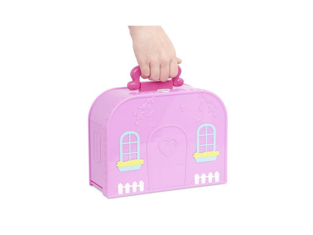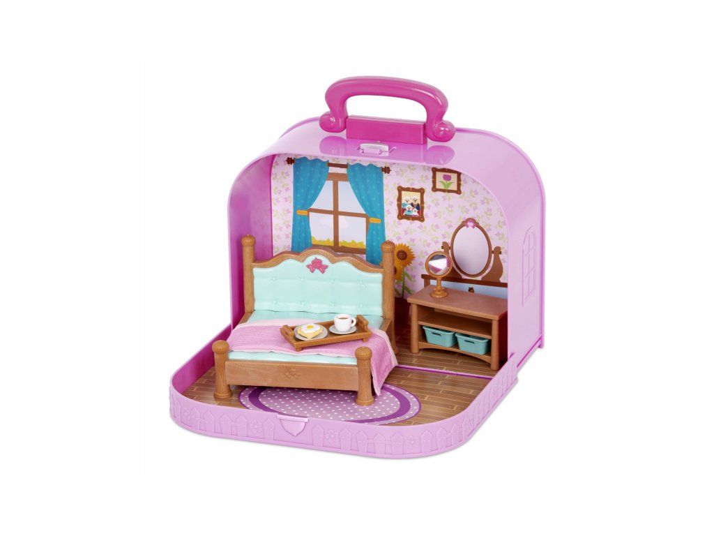 15-dielna sada obsahuje kufrík, 2 postavičky zvieratiek, posteľ, prikrývku, komodu, 2 košíky, zrkadlo, podnos, tanier, vyprážané vajcia, toast, šálku kávy a podšálku.