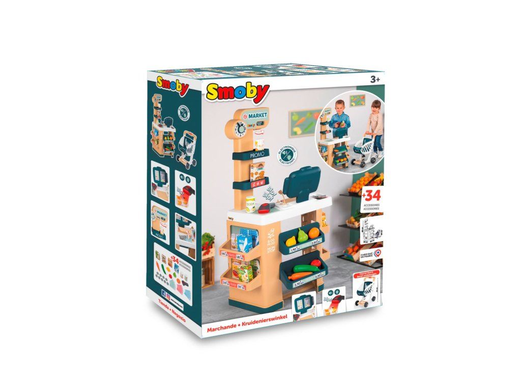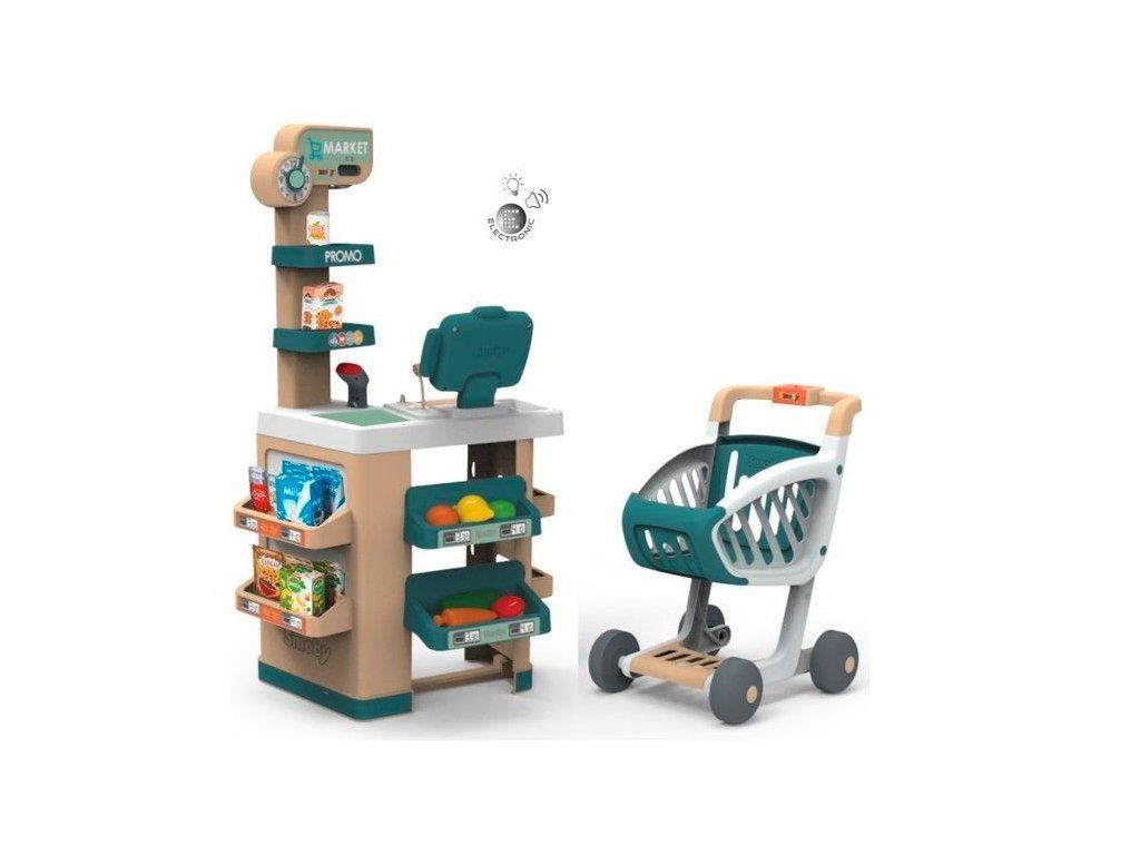 Supermarket s elektronickou pokladňou vr. integrované funkcie výpočtu, skenerom so zvukom a svetlom a ďalším príslušenstvom. Súčasťou je aj nákupný vozík. Rozmery: 48,9 x 38,5 x 89,6 cm.Dodatočné parametre