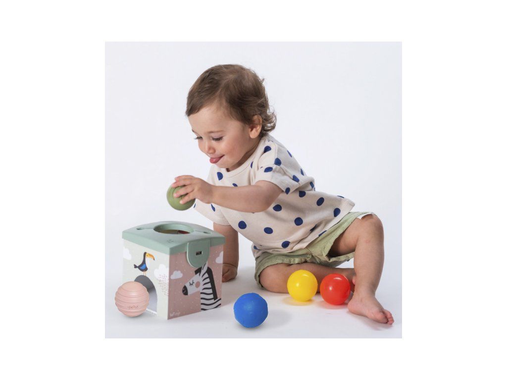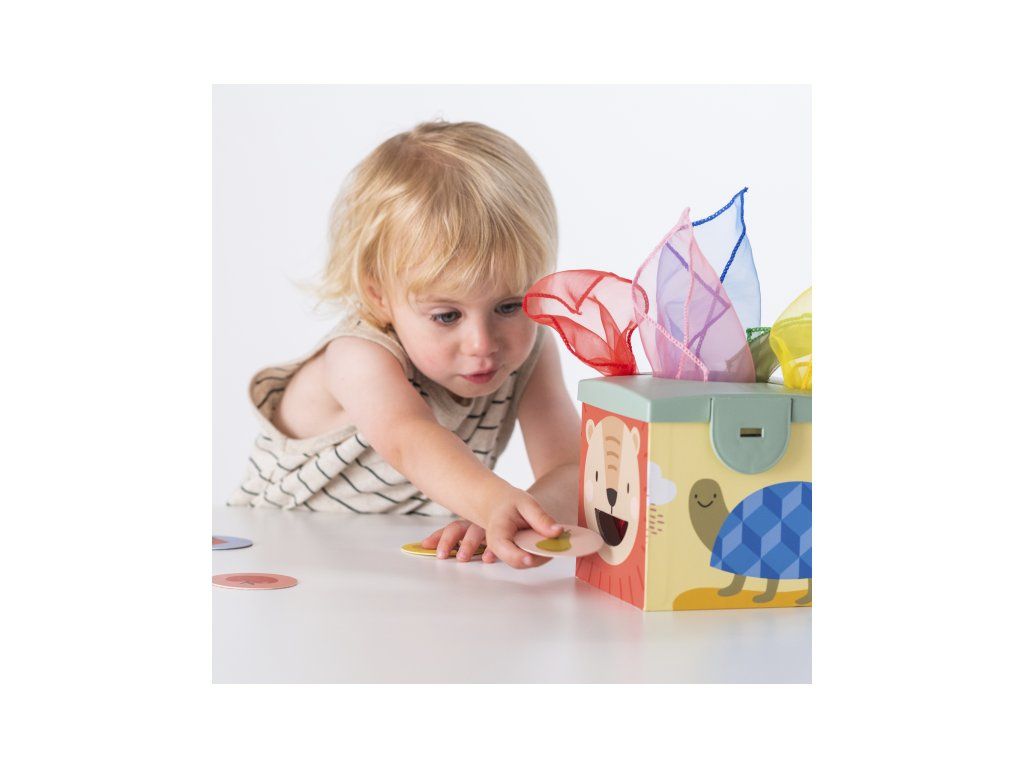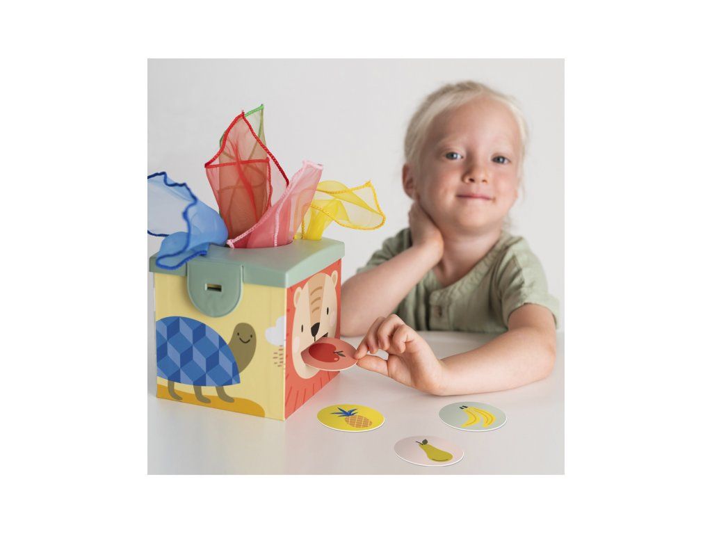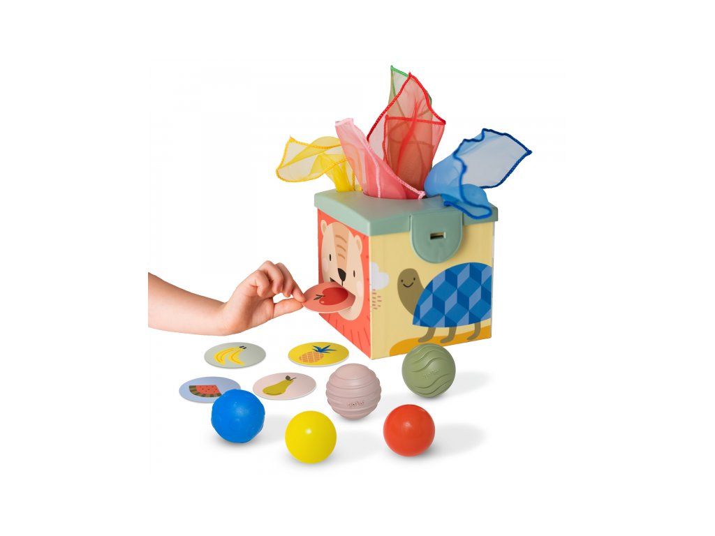 Magic Box obsahuje všetko, s čím sa malé deti rady hrajú! V kúzelnej krabici nájdu loptičky, šatky a obojstranné okrúhle kartičky s obrázkami. Šatky je zábavné z krabice vyťahovať, kartičkami zase kŕmiť večne hladného medvedíka na boku krabice. Loptičky sa po vhodení do otvoru na krabici vykotúľa otvorom z boku.