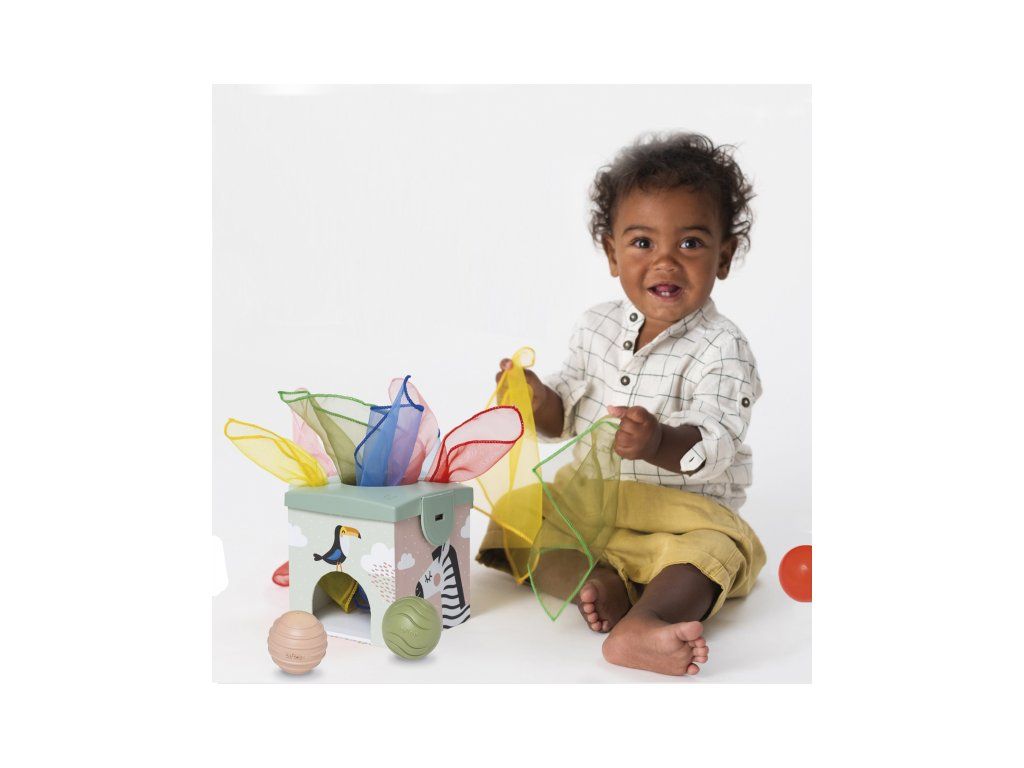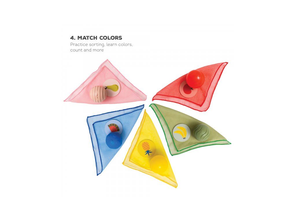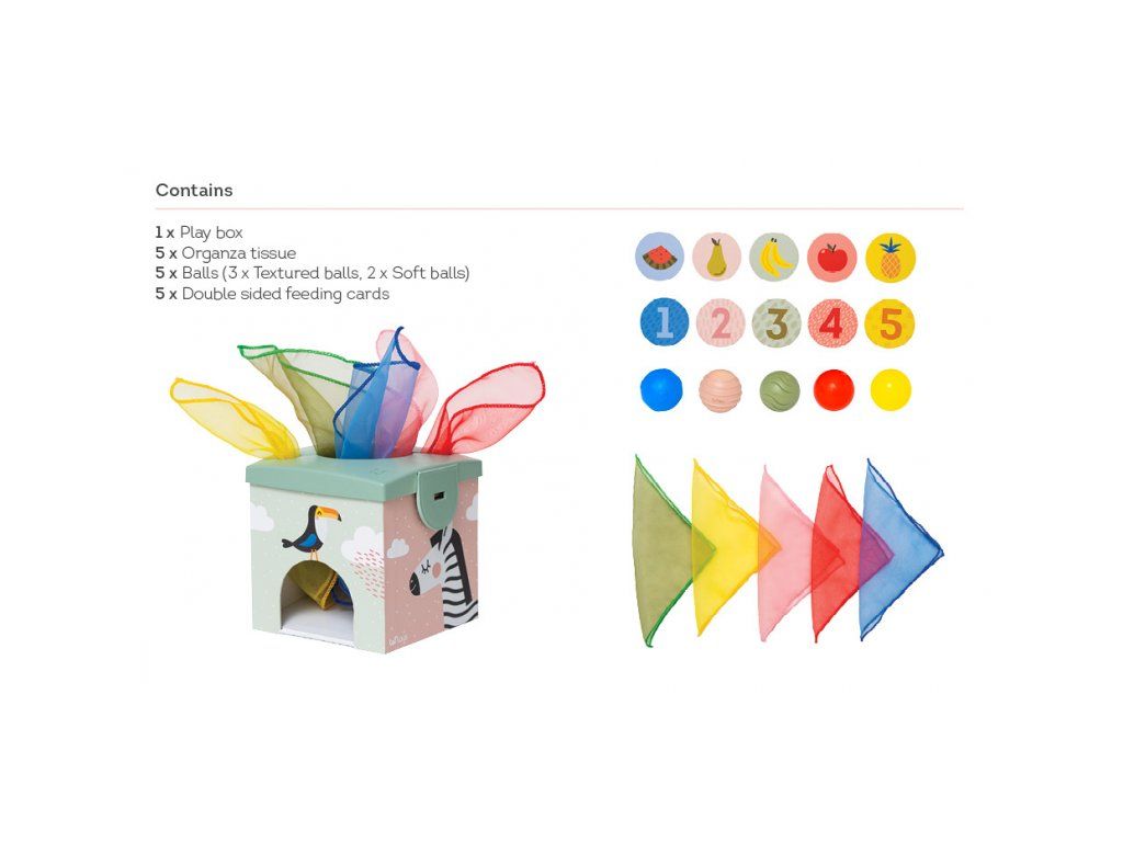 Šatky z jemnej organzy a loptičky s rôznorodými textúrami pomáhajú rozvíjať dieťaťu úchop a jemnú motoriku. Pri kŕmení usmievavého medvedíkmi kartičkami s obrázkami ovocia sa rozvíja emočná inteligencia a predstavivosť dieťaťa.