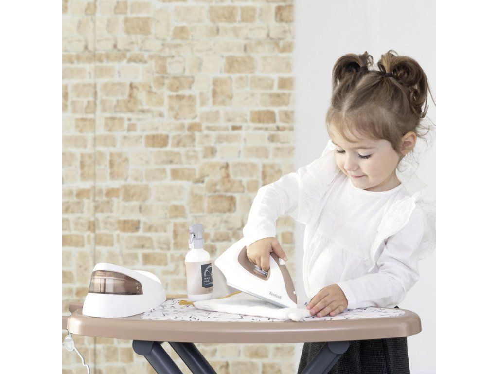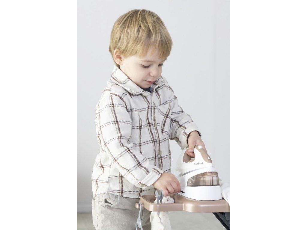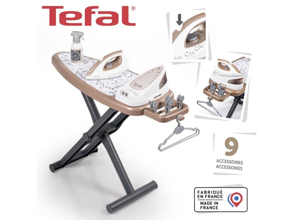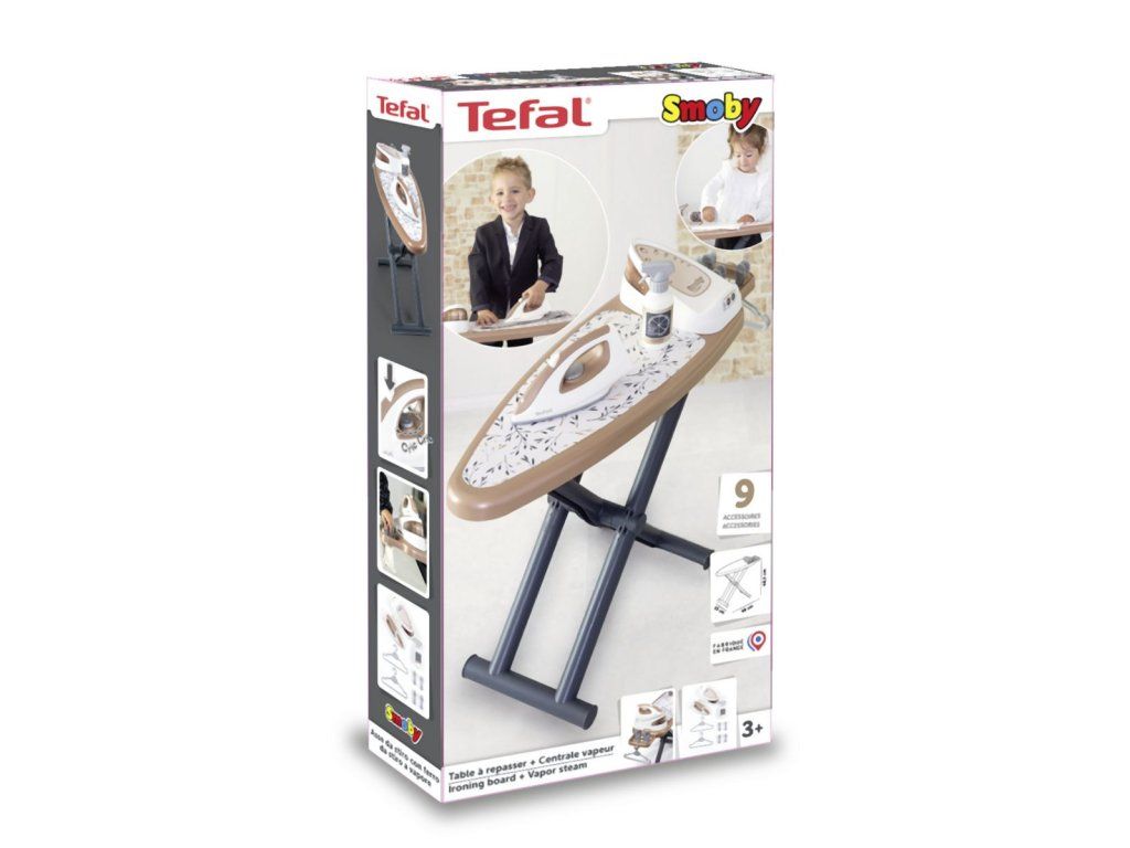 Realistická žehliaca doska s parnou stanicou Tefal, vrátane žehličky s mechanickým otočným gombíkom so zvukom "crick-crack". Súčasťou 2 ramienka, 4 štipce na bielizeň a fľaštička so sprejom na bielizeň. Žehliacu dosku možno rýchlo zložiť. Rozmery produktu (DxŠxV): 23x 48 x 48,5 cm.Dodatočné parametre