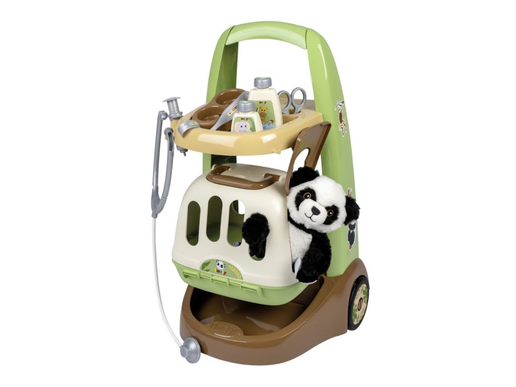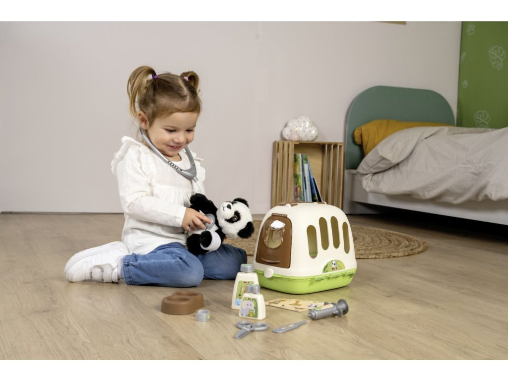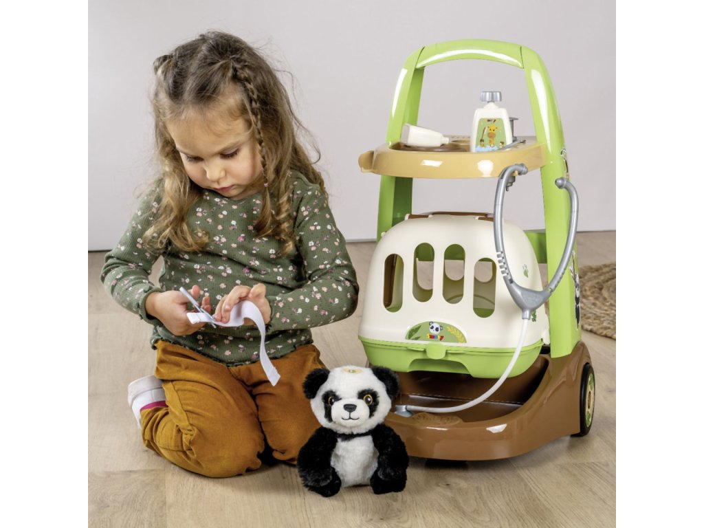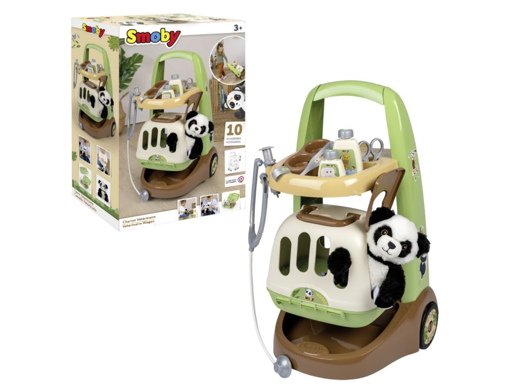 Veterinársky vozík s mäkkým plyšovým zvieratkom, prepravným boxom 2 v 1 s odnímateľným mobilným lekárskym kufrom a množstvom príslušenstva. Vďaka kolieskam s ľahkým chodom je mobilný lekársky vozík ovládateľný a je možné ho ľahko riadiť. Príslušenstvo obsahuje všetko, čo skutočný veterinár potrebuje na liečbu svojich štvornohých pacientov: stetoskop, injekčnú striekačku, nožnice, misku s krmivom pre zvieratá, náramok a dve fľaštičky (šampón alebo liek). Roztomilé zvieratko dopĺňa túto sadu pre veterinára, rovnako ako skvelý kufor 2 v 1, ktorý je možné použiť ako prepravný box pre zvieratka aj ako pojazdný kufrík pre veterinára, ktorý je možné používať aj samostatne. K tomu je možné puzdro z hornej časti jednoducho odopnúť a všetko príslušenstvo ľahko umiestniť dovnútra puzdra. Rozmery produktu (D׊×V): 31 × 32,1 × 55,2 cm.Dodatočné parametre