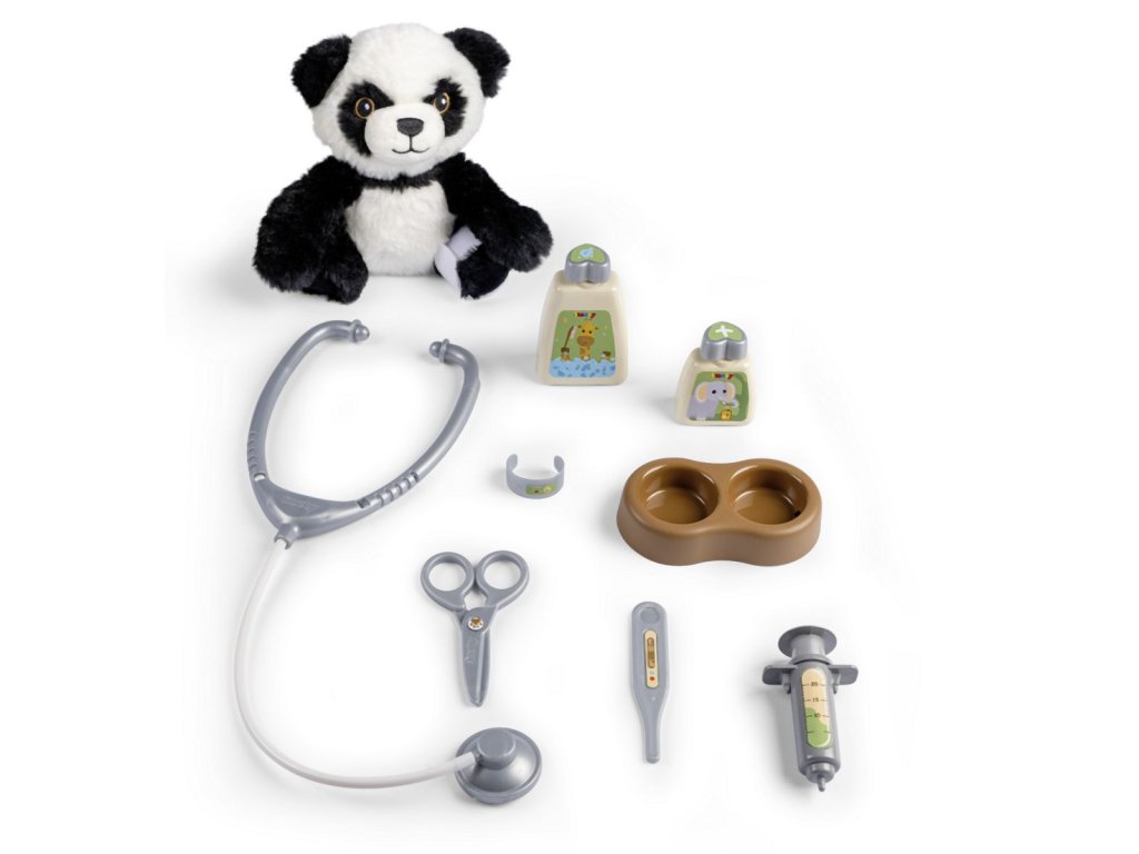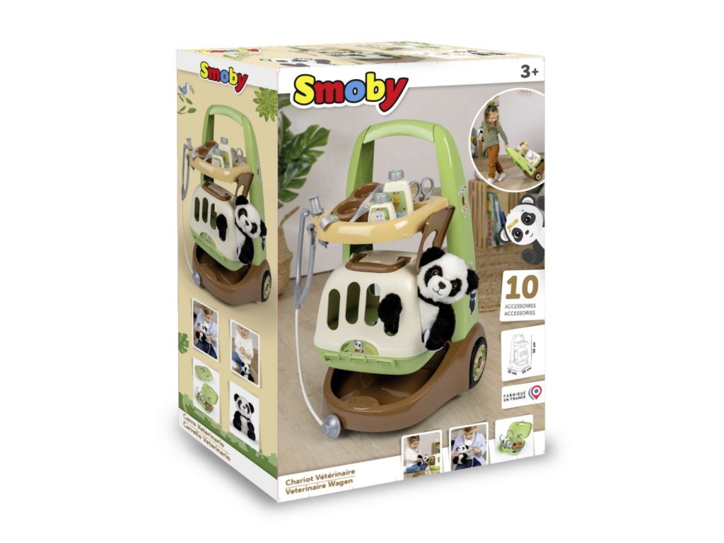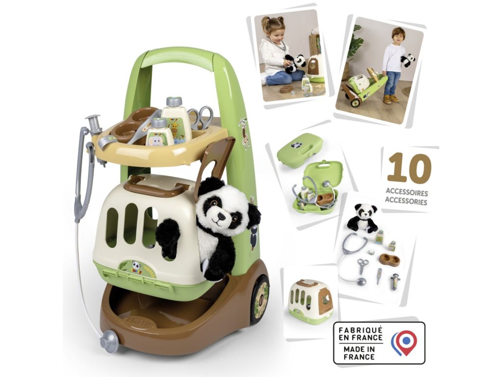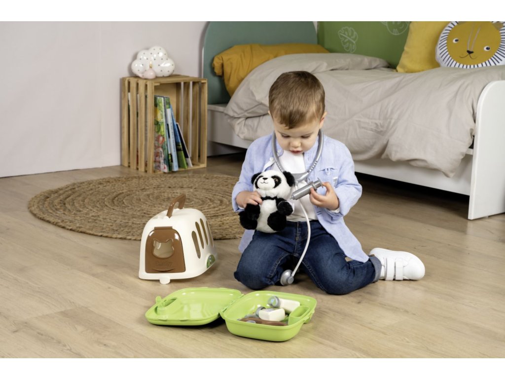 Veterinársky vozík s mäkkým plyšovým zvieratkom, prepravným boxom 2 v 1 s odnímateľným mobilným lekárskym kufrom a množstvom príslušenstva. Vďaka kolieskam s ľahkým chodom je mobilný lekársky vozík ovládateľný a je možné ho ľahko riadiť. Príslušenstvo obsahuje všetko, čo skutočný veterinár potrebuje na liečbu svojich štvornohých pacientov: stetoskop, injekčnú striekačku, nožnice, misku s krmivom pre zvieratá, náramok a dve fľaštičky (šampón alebo liek). Roztomilé zvieratko dopĺňa túto sadu pre veterinára, rovnako ako skvelý kufor 2 v 1, ktorý je možné použiť ako prepravný box pre zvieratka aj ako pojazdný kufrík pre veterinára, ktorý je možné používať aj samostatne. K tomu je možné puzdro z hornej časti jednoducho odopnúť a všetko príslušenstvo ľahko umiestniť dovnútra puzdra. Rozmery produktu (D׊×V): 31 × 32,1 × 55,2 cm.Dodatočné parametre