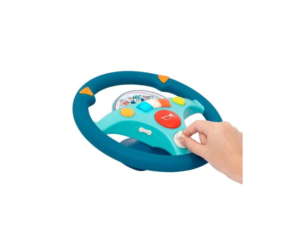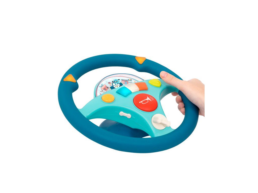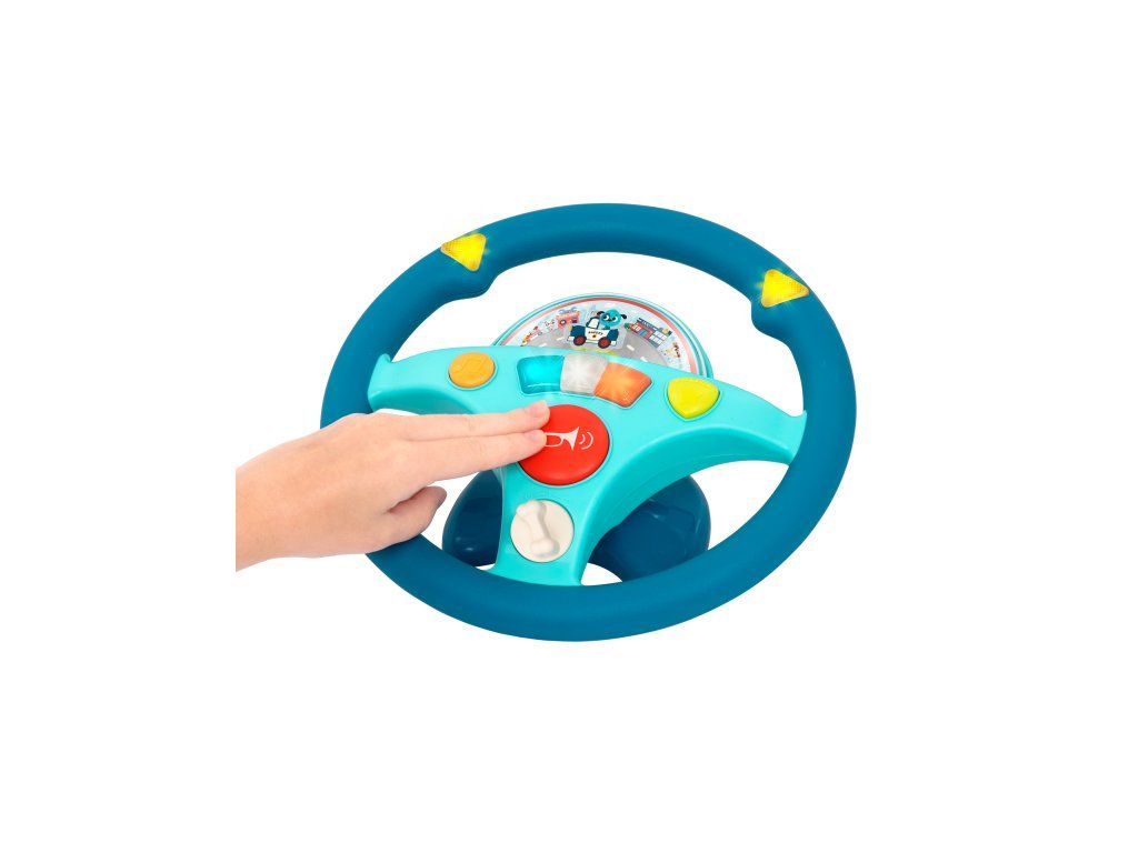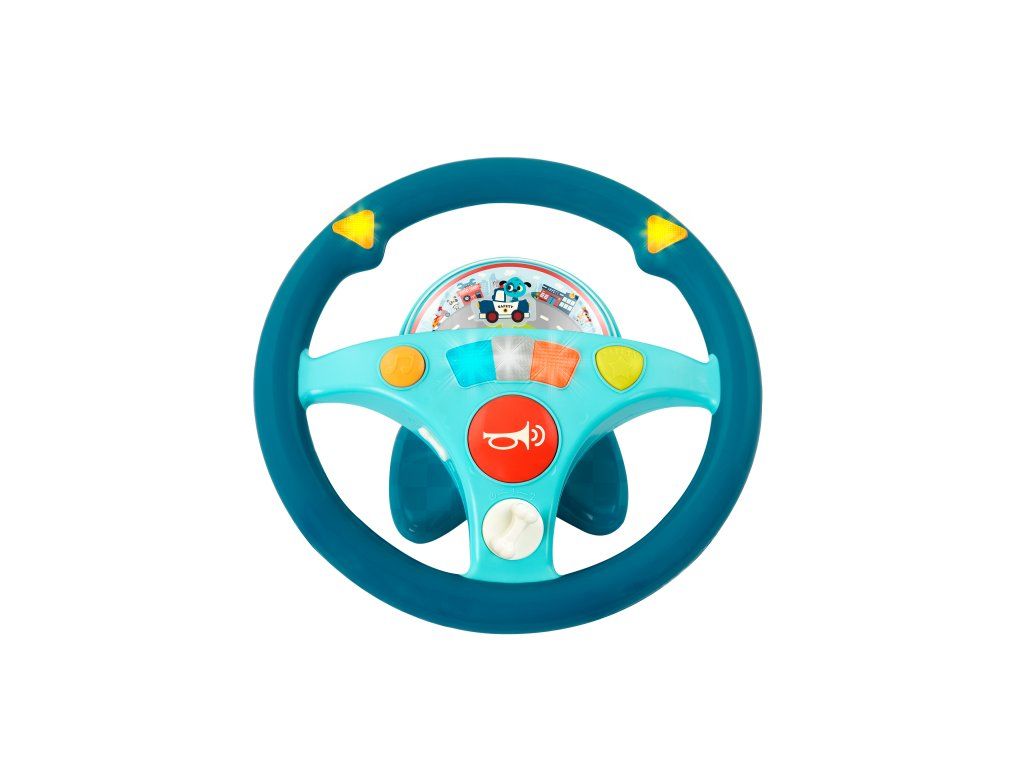 Interaktívny volant pre malého vodiča je ideálnou hračkou do autosedačky. Malý vodič môže otáčaním volantu púšťať smerovky. Na riadenie si môže pustiť pesničku. Volant vydáva aj zvuky motora a je vybavený húkačkou. Pod priehľadným krytom je malé autíčko a pohybujúca sa ulica mesta, autíčko ulicou ide dopredu alebo cúva.