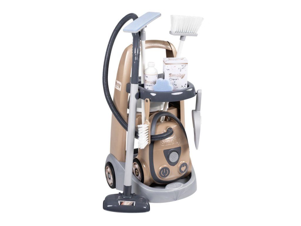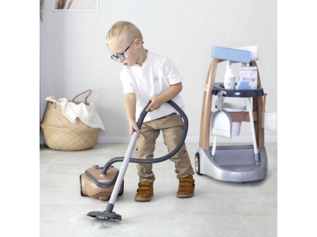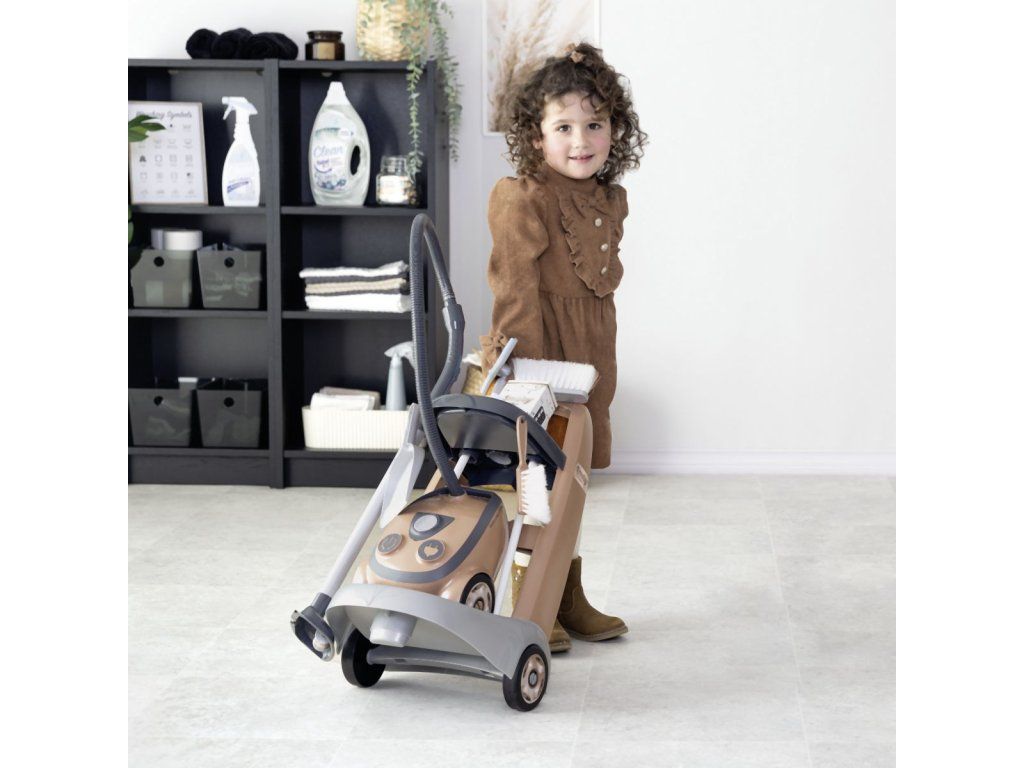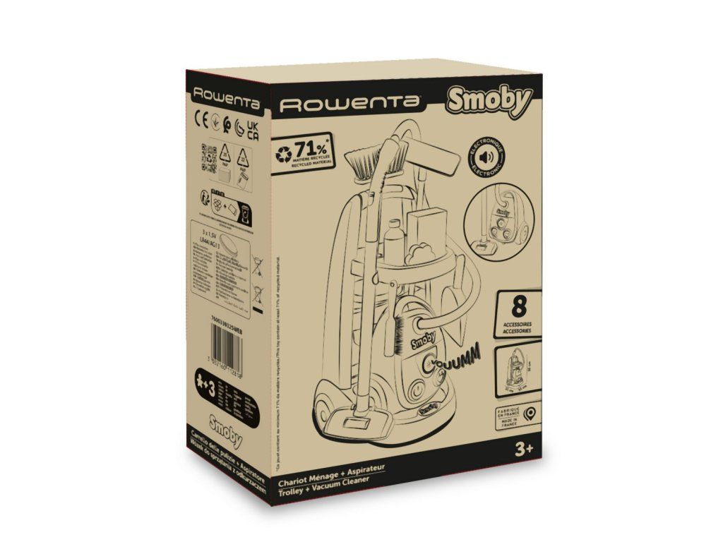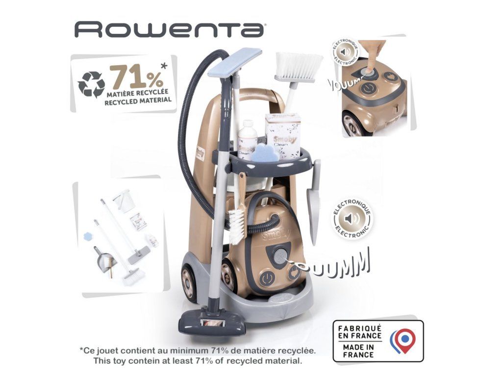 Upratovací vozík s vysávačom Rowenta s príslušenstvom. Detský vysávač vydáva skutočný zvuk vysávača. Vďaka kompaktnej veľkosti a nízkej hmotnosti je ľahko ovládateľný aj pre menšie deti od 3 rokov. Ďalšie príslušenstvo k upratovaciemu vozíku: lopatka a metlička, mop a makety obalov od čistiacich prostriedkov atď. Tento výrobok obsahuje minimálne 71 % recyklovaného materiálu. Rozmery produktu (DxŠxV): 31 x 32 x 55 cm.Dodatočné parametre