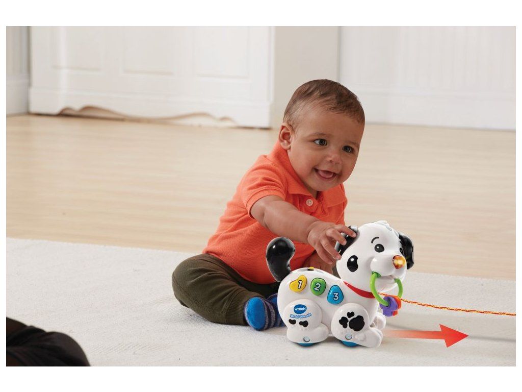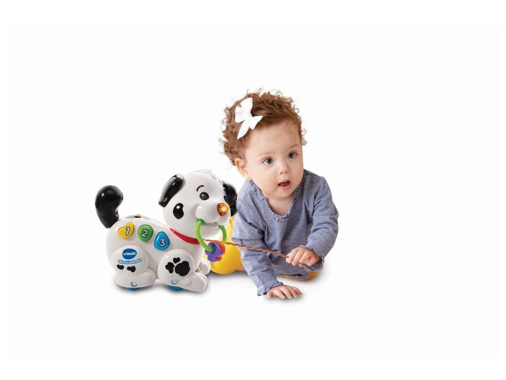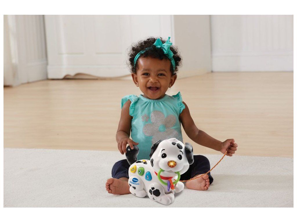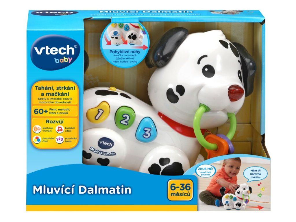 Hovoriaci Dalmatín od VTech® je hravé interaktívne šteniatko, ktoré miluje prechádzky! Šteniatko je možné ťahať, tlačiť, alebo sa hrať s jeho farebnými tlačidlami. Tlačidlá majú za úlohu predstaviť deťom prvé čísla a naučiť spoznávať niektoré farby. Stlačením tlačidiel sa tiež prehrávajú pesničky, zábavné frázy alebo melódie. Určené pre deti od 6 mesiacov Súčasťou sú testovacie batérie: 2xAAADodatočné parametre