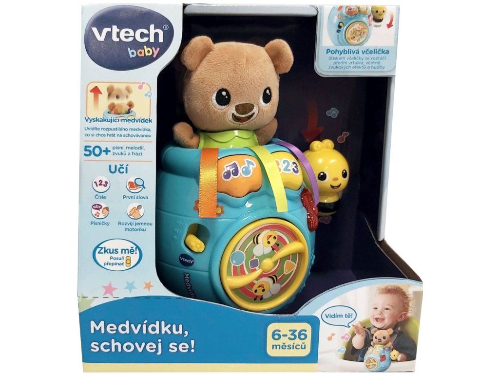 Vtech Medvedík, schovaj sa! je legendárna hudobná a vzdelávacia hračka pre deti už od 6 mesiacov. Roztomilými frázami interaktívne komunikuje s dieťaťom. Ľahkým zatlačením medvedíka do hrnca sa medvedík schová. Následným stlačením tlačidla potom medvedík ""vyskočí"" z hrnca von. Všetko je sprevádzané zábavnými frázami, piesňami a melódiami. Pohyblivá včielka na boku hrnca s medom dokáže tiež roztočiť vrtuľku na prednej časti hrnca. Hračka tiež nenásilnou formou učí deti pesničky, poznávať čísla a rozširuje slovnú zásobu. Tlačenie na medvedíka, posúvanie a tiež napríklad točenie vrtuľou pomáha rozvíjať jemné motorické zručnosti. Zahrá 15 melódií a zaspieva 3 pesničkyDodatočné parametre