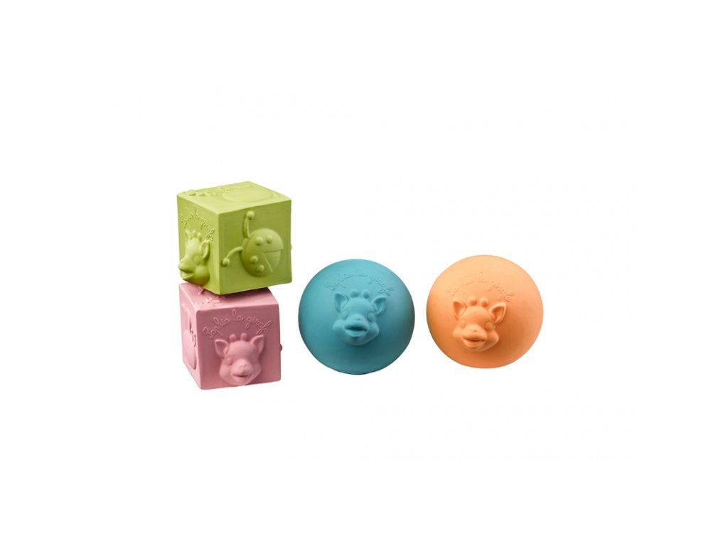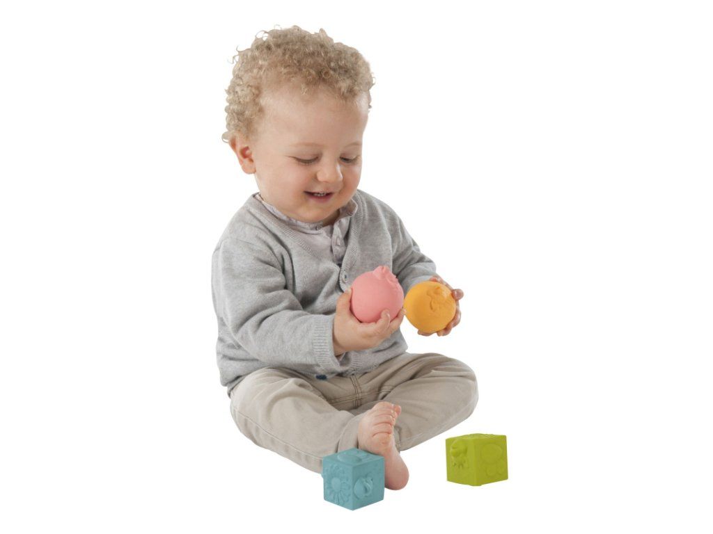 Pri manipulácii s kockami a loptičkami rozvíja dieťa svoje motorické schopnosti – ich hádzaním a chytaním. Na každej kocke a loptičke objavuje dieťa rôzne tvary tváričiek zvieratiek a ich jasné farby stimulujú jeho zrak. Vyrobené zo 100% prírodného kaučuku, dieťa ich môže bezpečne hrýzť. Sú ľahké a ľahko sa uchopujú.