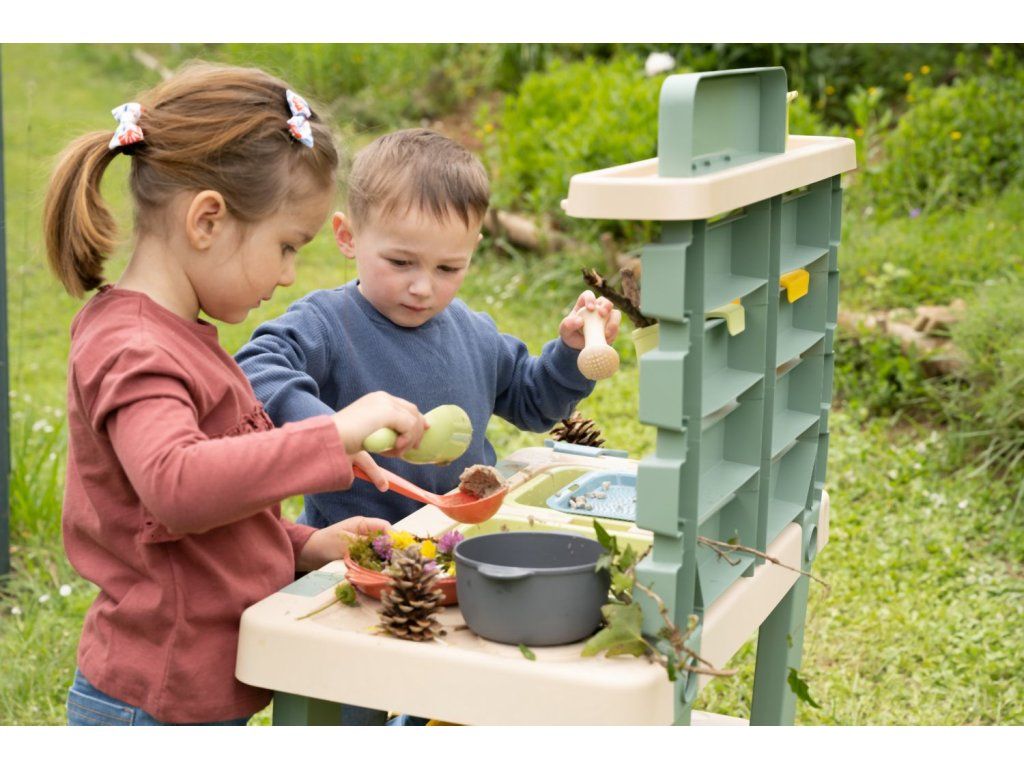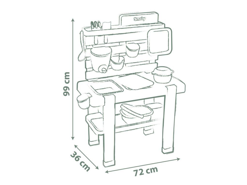 Vonkajšia kuchynka vybavená rôznym príslušenstvom, celkom 15 ks doplnkov. Plastové diely sú ošetrené anti-UV, čo zaisťuje dobrú odolnosť a stálosť farieb v priebehu času. Tento výrobok obsahuje minimálne 90% recyklovaného materiálu. Rozmery výrobku (DxŠxV): 72 x 36 x 99 cm.Dodatočné parametre