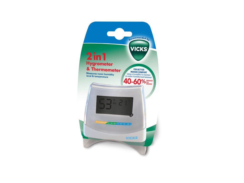 -Vlhkomer a teplomer Vicks® 2 v 1 vám umožňuje monitorovať úroveň vlhkosti a zobrazovať teplotu v miestnosti.