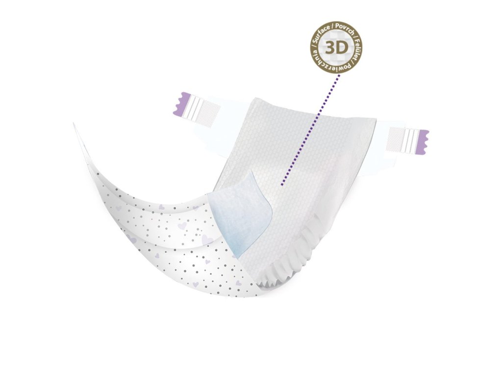 - 3D suchý zips, vďaka ktorému sa plienka dokonale prispôsobí tvaru bruška