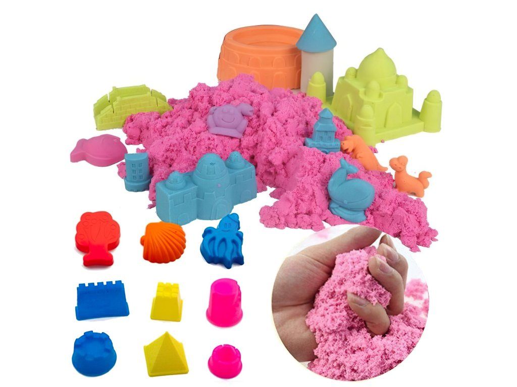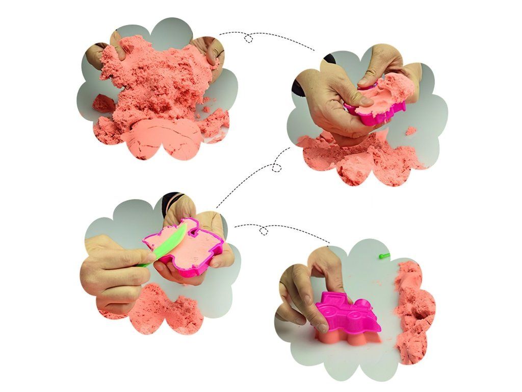 Táto kúzelná sada obsahuje 2 kg kinetického piesku. Bezpečný a ľahko formovateľný piesok umožňuje deťom tvoriť rozmanité tvary, stavby a postavičky bez nutnosti používať vodu. Po čase hrania sa piesok ľahko vráti späť do svojej pôvodnej podoby, čo uľahčuje jeho údržbu.