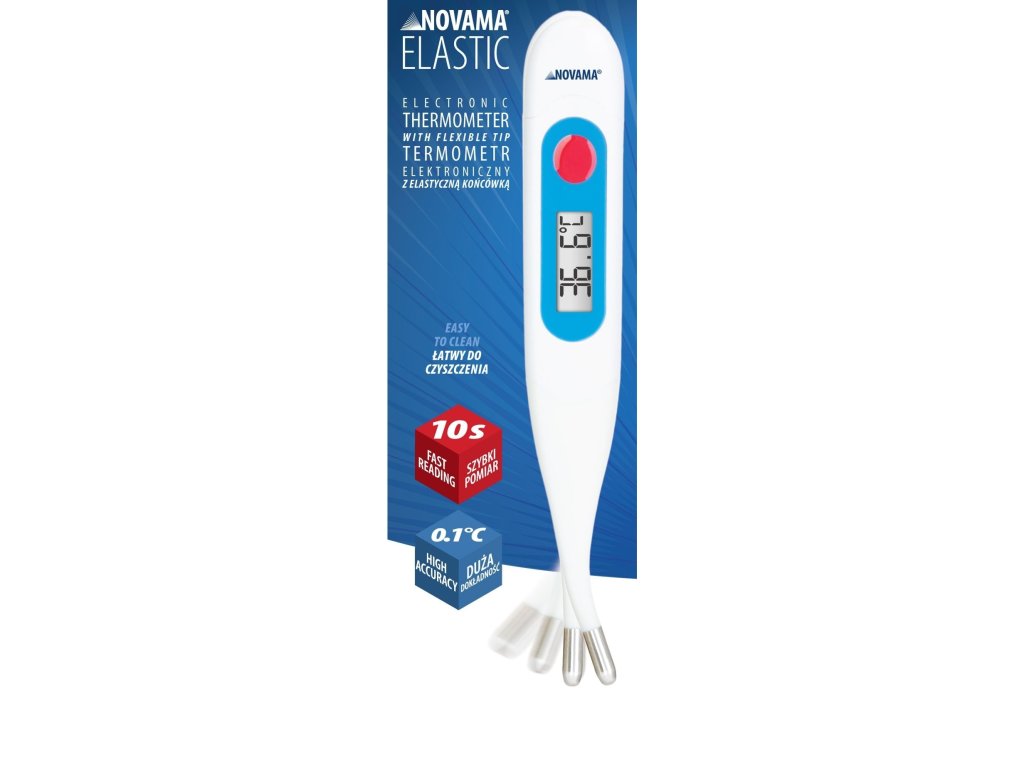 NOVAMA ELASTIC Digitálny teplomer s ohybnou špičkou je bezpečný, presný a pohodlný teplomer, ktorý je ideálny pre použitie v domácnosti. Vďaka svojim praktickým funkciám a ohybnej špičke je vhodný pre meranie teploty u detí aj dospelých.