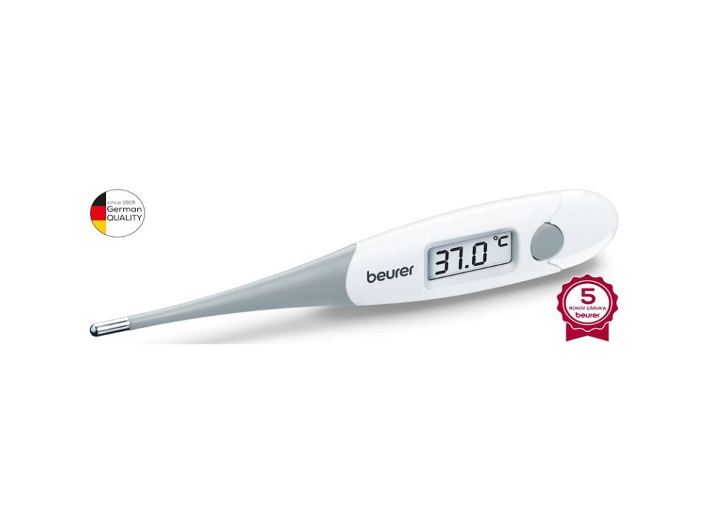 Teplomer BEURER FT15. Charakteristika a technické údaje: rýchle kontaktné meranie merací čas cca 10 sekúnd, varovný signál pri teplote nad 37,8 °C vodotesný, bez ortuti a bez skla, display v °C a °F možnosť dezinfikovať presnosť merania: 35.5-42 °C /odchýlka 0,1 °C/ úložný priestor, ochranný kryt automatické vypnutie zvukový signál po dokončení merania lekársky produkt batérie súčasťou baleniaDodatočné parametre