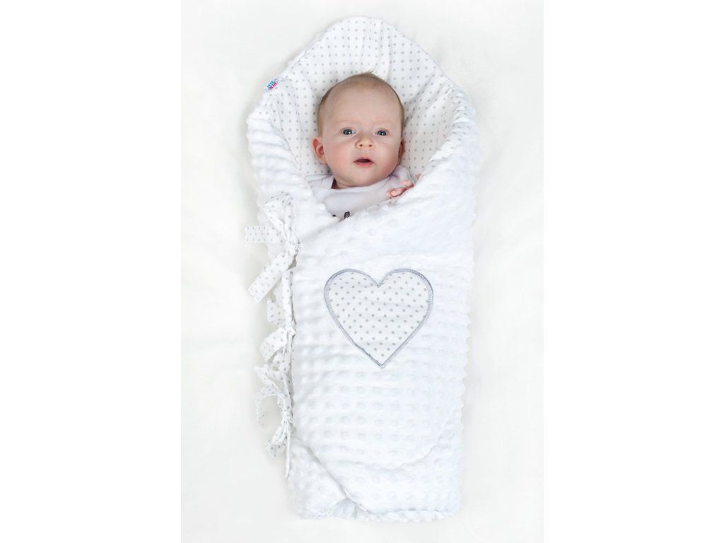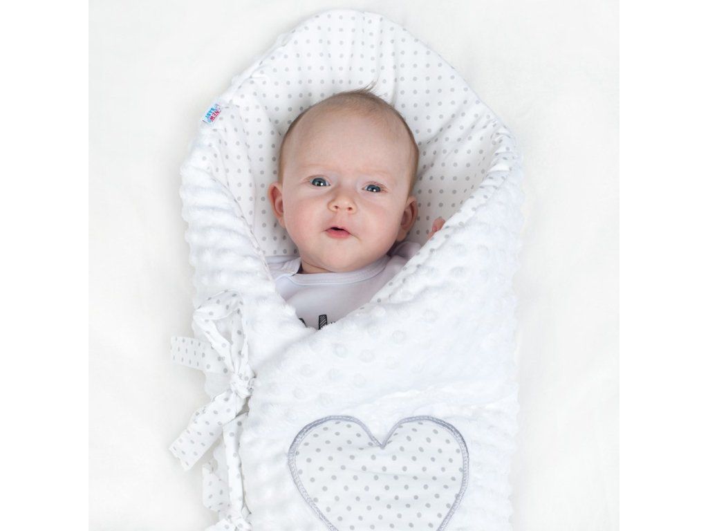Luxusná šnurovacia zavinovačka z Minky New Baby. Zavinovačka je vyrobená z dvoch typov tkanín a je zdobená krásnym vyšívaným srdiečkom a sivým bodkovaným bavlneným podkladom. Prvá je veľmi mäkká a na dotyk príjemná, hebká Minky látka s výstupkami pre stimuláciu senzomotoriky a druhou je 100% bavlna. Zavinovačka sa zaväzuje na tri rady stúh, ktoré Vaše bábätko pevne zavinú.