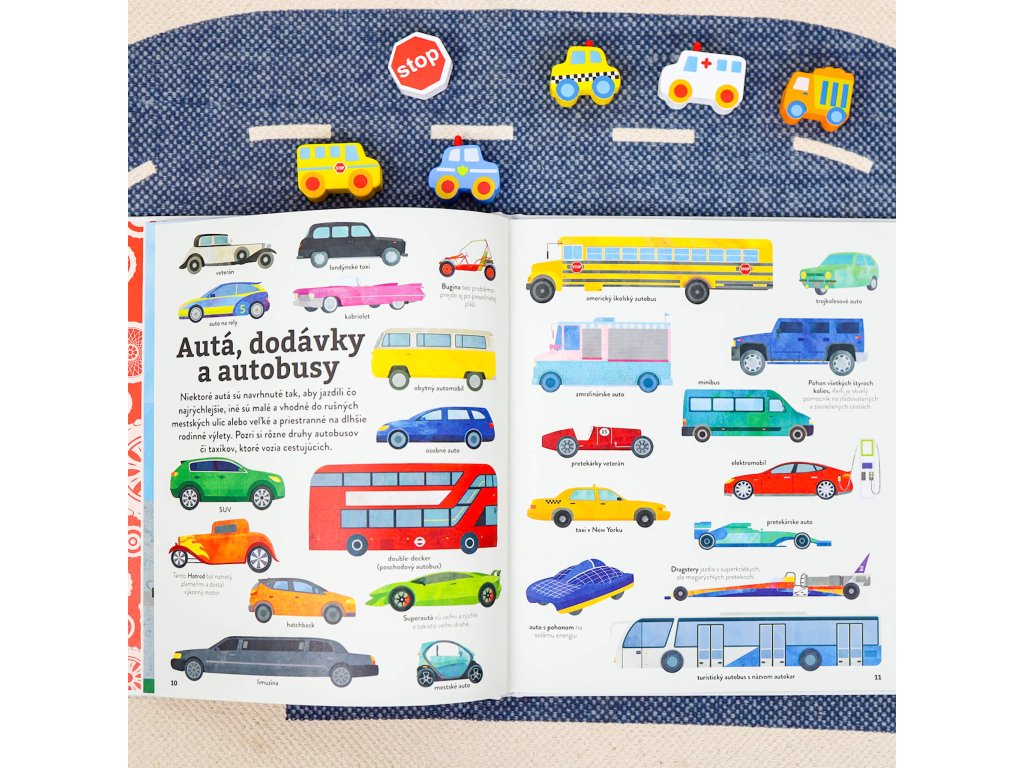Autá a všetko s kolesami Autá, električky, vlaky, lietadlá, ale aj tuk-tuky, trojkolky či dráhové bicykle. Niektoré majú dve, iné tri, štyri a dokonca aj osem kolies! Načo ich potrebujú? Pri akých činnostiach sa používajú rôzne dopravné prostriedky a môžete všetky z nich stretnúť na ceste? Odpovede na tieto otázky nájdete v knihe Autá a všetko s kolesami.V tejto knihe spoznáte nielen tieto, ale aj kopu iných dopravných prostriedkov z každého kúta sveta. Zoznámte sa so súčasťami hasičskej stanice, s vozidlami, ktoré obsluhujú stavby i s tými, ktoré jazdia hore-dole po letiskách. Pri každom listovaní v tejto pestro ilustrovanej knihe si všimnete niečo nové a zaujímavé.Dodatočné parametre