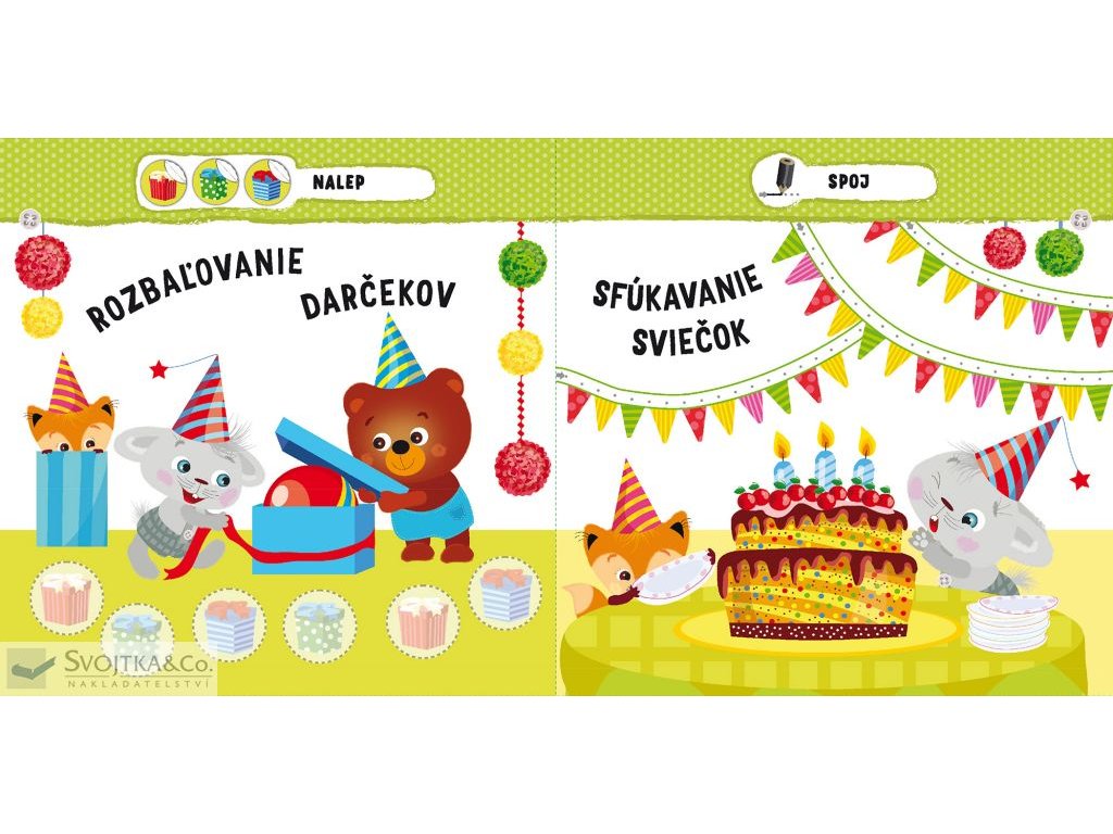 Malý zajačik - Narodeniny V tejto knižke nájdu naši najmenší malého zajačika a plno jednoduchých aktivít, ktoré im pomôžu spoznať, čo sa deje na narodeninovej oslave. Všetko najlepšie! Osláv narodeniny spolu s malým zajačikom! Prekvapenie! Malý zajačik má dnes narodeniny a už sa veľmi teší. Kto príde na oslavu? Treba vyzdobiť izbu a upiecť tortu. Kto oslávenca pobaví? Bude to klaun! Všetko musíš ešte správne vyfarbiť, spojiť a nalepiť samolepky na tie správne miesta. V tejto knižke sa naši najmenší naučia, čo sa deje na detskej narodeninovej oslave, aj vďaka jednoduchým aktivitám nielen so samolepkami. Tak rýchlo, pusť sa spoločne s malým zajačikom do učenia!Dodatočné parametre