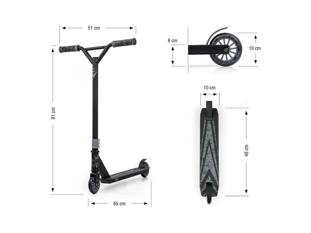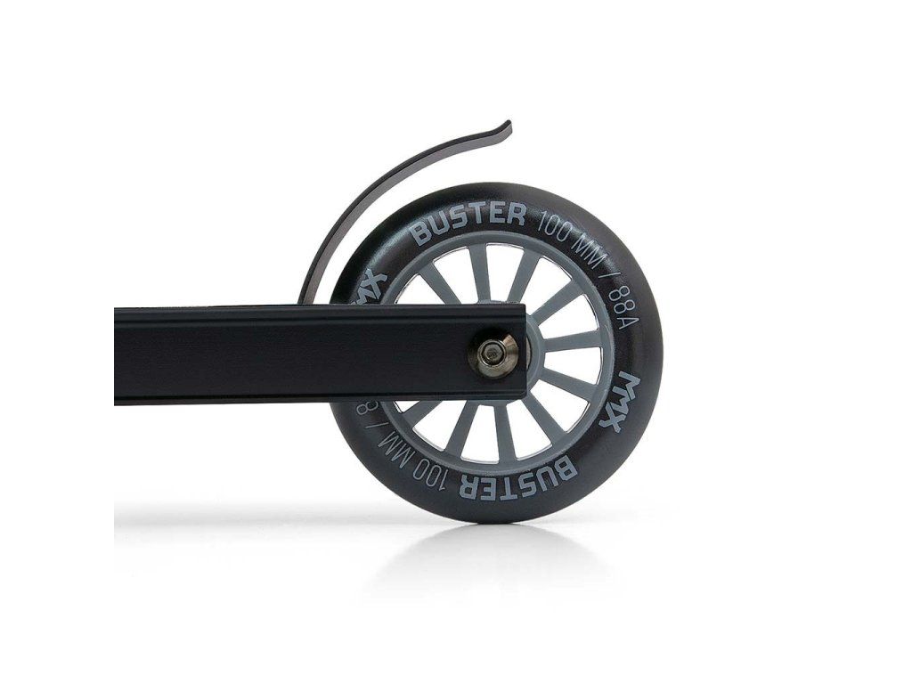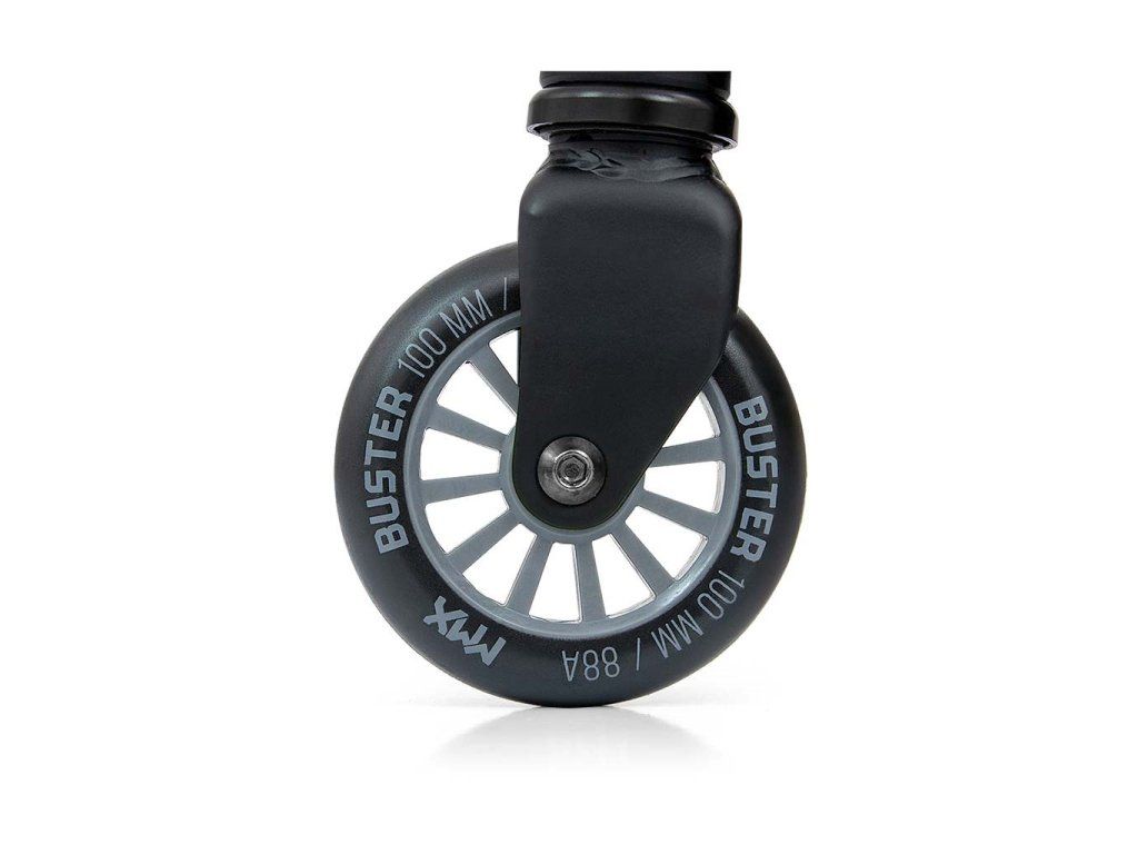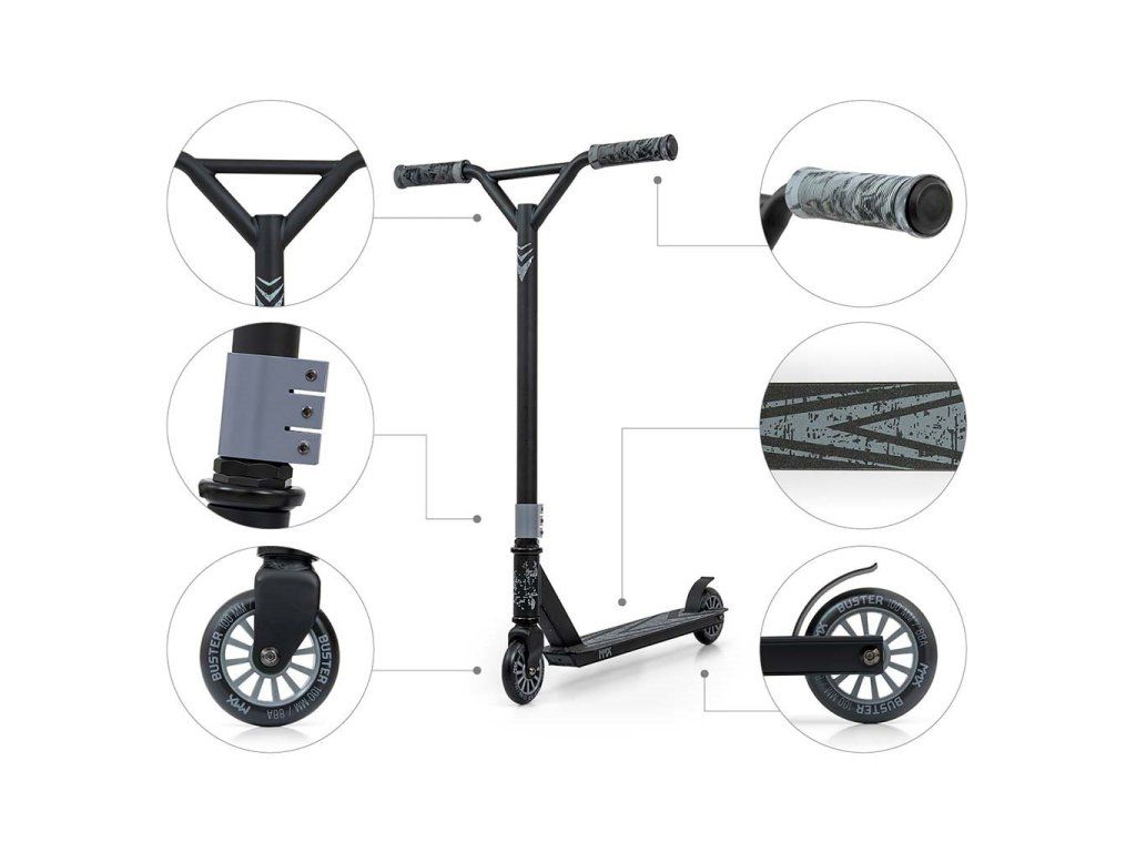 Freestyle kolobežky sú vyrobené z najkvalitnejších materiálov, aby bola zabezpečená najvyššia úroveň bezpečnosti počas freestylové jazdy. Konštrukcia kolobežky BUSTER je kombináciou hliníka a ocele, čo vedie k nízkej hmotnosti pri zachovaní dostatočnej tuhosti a najvyššej odolnosti. BUSTER je optimálnym vybavením pre začiatočníkov a stredne pokročilých používateľov. Široké riadidlá so zosilnenou konštrukciou a pogumované rukoväte z odolnej termoplastickej gumy TPR zaisťujú pevný úchop, ktorý je zárukou bezpečnosti pri vykonávaní kaskadérskych kúskov a trikov. Nášľapná doska kolobežky je vyrobená z hliníka, je pokrytá protišmykovým povrchom a zakončená nášľapnou brzdou FLEX BRAKE. Kolieska sú vyrobené z najkvalitnejšieho PU s nylonovým jadrom a ložiskami ABEC-7 - táto kombinácia zaručuje odolnosť, kvalitu a bezpečnosť pre tých, ktorí začínajú svoje dobrodružstvo s freestylovými kolobežkami.