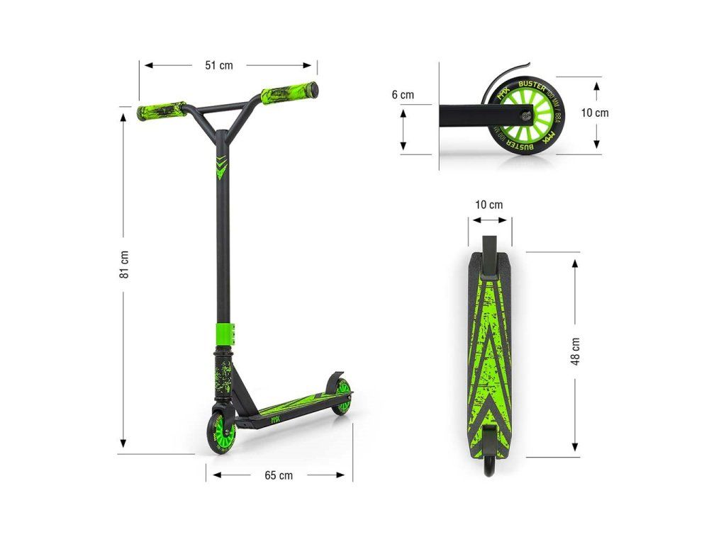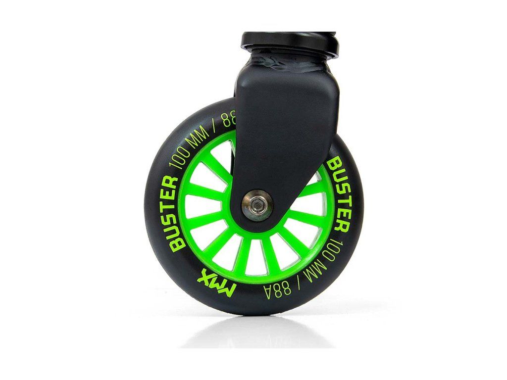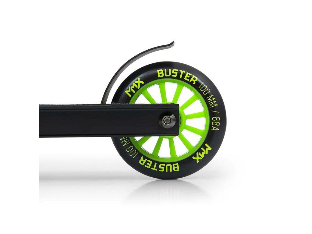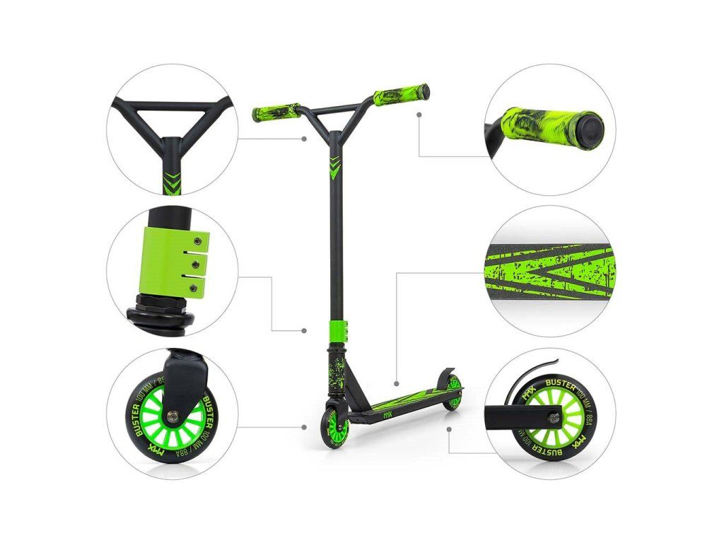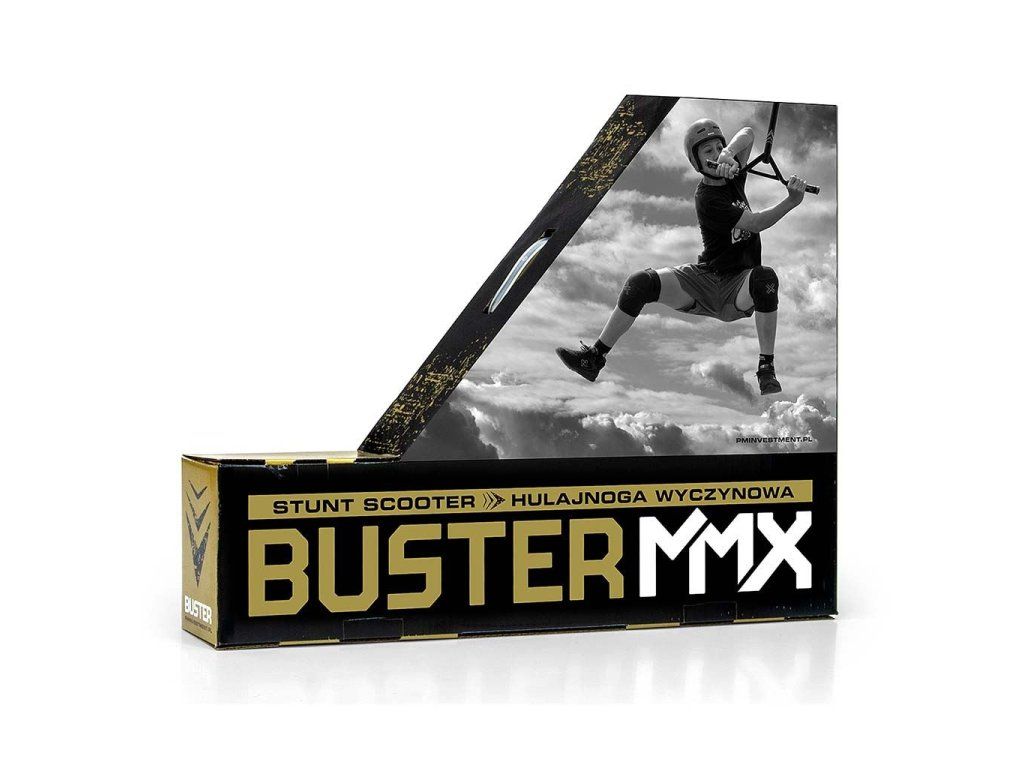 Freestyle kolobežky sú vyrobené z najkvalitnejších materiálov, aby bola zabezpečená najvyššia úroveň bezpečnosti počas freestylové jazdy. Konštrukcia kolobežky BUSTER je kombináciou hliníka a ocele, čo vedie k nízkej hmotnosti pri zachovaní dostatočnej tuhosti a najvyššej odolnosti. BUSTER je optimálnym vybavením pre začiatočníkov a stredne pokročilých používateľov. Široké riadidlá so zosilnenou konštrukciou a pogumované rukoväte z odolnej termoplastickej gumy TPR zaisťujú pevný úchop, ktorý je zárukou bezpečnosti pri vykonávaní kaskadérskych kúskov a trikov. Nášľapná doska kolobežky je vyrobená z hliníka, je pokrytá protišmykovým povrchom a zakončená nášľapnou brzdou FLEX BRAKE. Kolieska sú vyrobené z najkvalitnejšieho PU s nylonovým jadrom a ložiskami ABEC-7 - táto kombinácia zaručuje odolnosť, kvalitu a bezpečnosť pre tých, ktorí začínajú svoje dobrodružstvo s freestylovými kolobežkami.